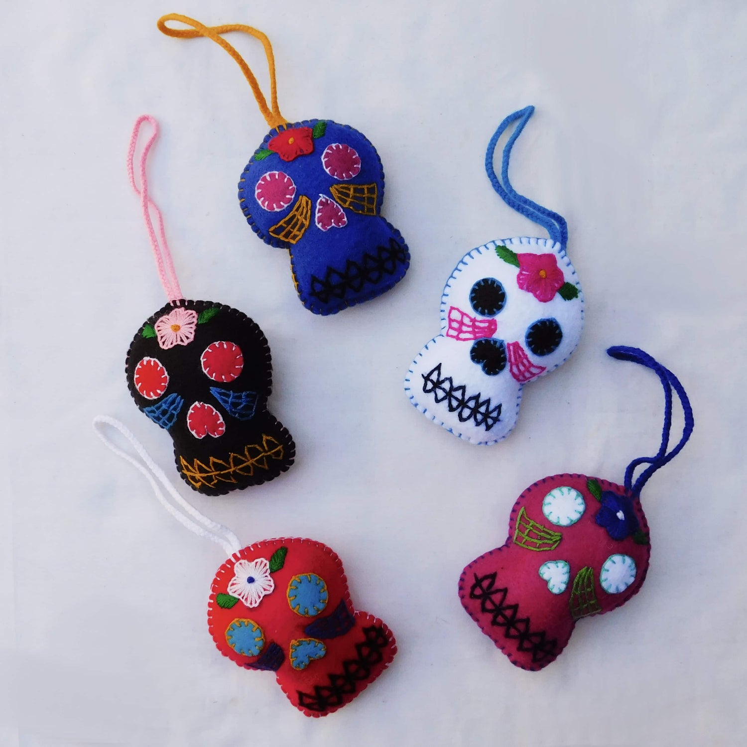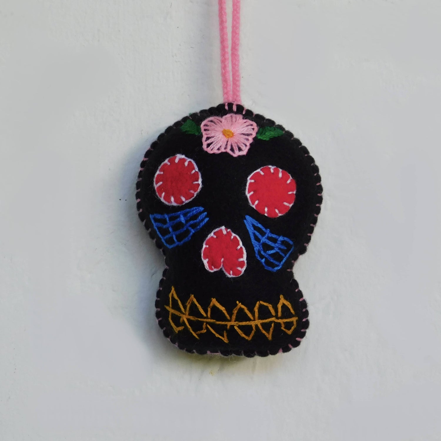 Dale vida a tu decoración con esta divertida calavera de fieltro, bordada a mano por artesanos guatemaltecos. Llena de colores vivos y detalles únicos, es perfecta para celebrar el Día de los Muertos con alegría y originalidad. Un adorno que aporta un toque artesanal y lleno de buen humor a cualquier espacio.