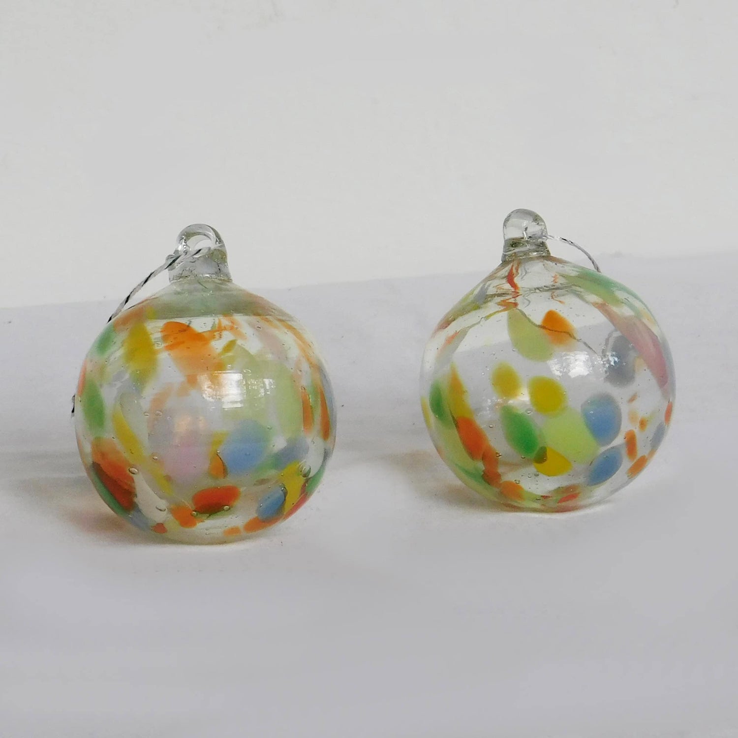 Añade un toque de alegría y color a tu espacio con estas esferas de vidrio soplado, hechas a mano con la técnica de vidrio soplado. Disponible en diseños de puntos multicolor, combinación de corinto con naranja y azul con verde para una decoración llena de vida y diversión.