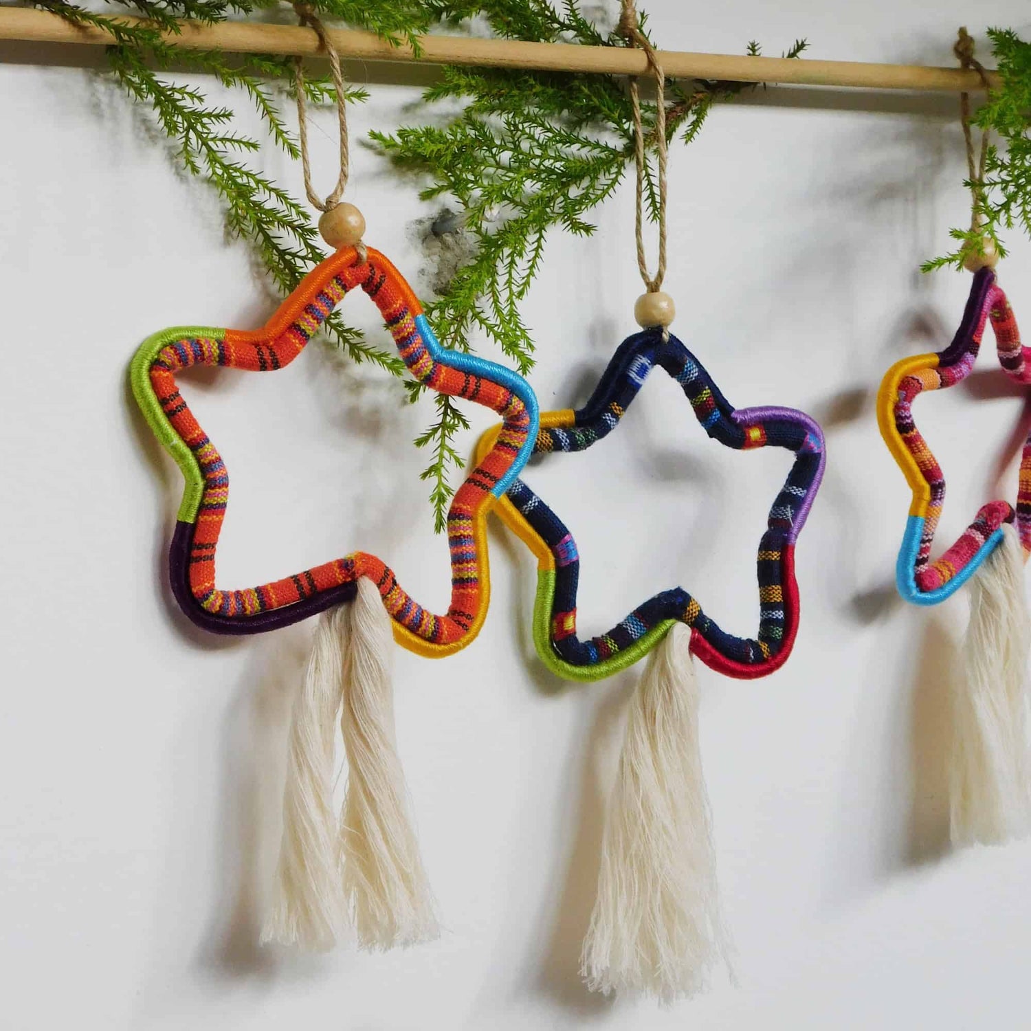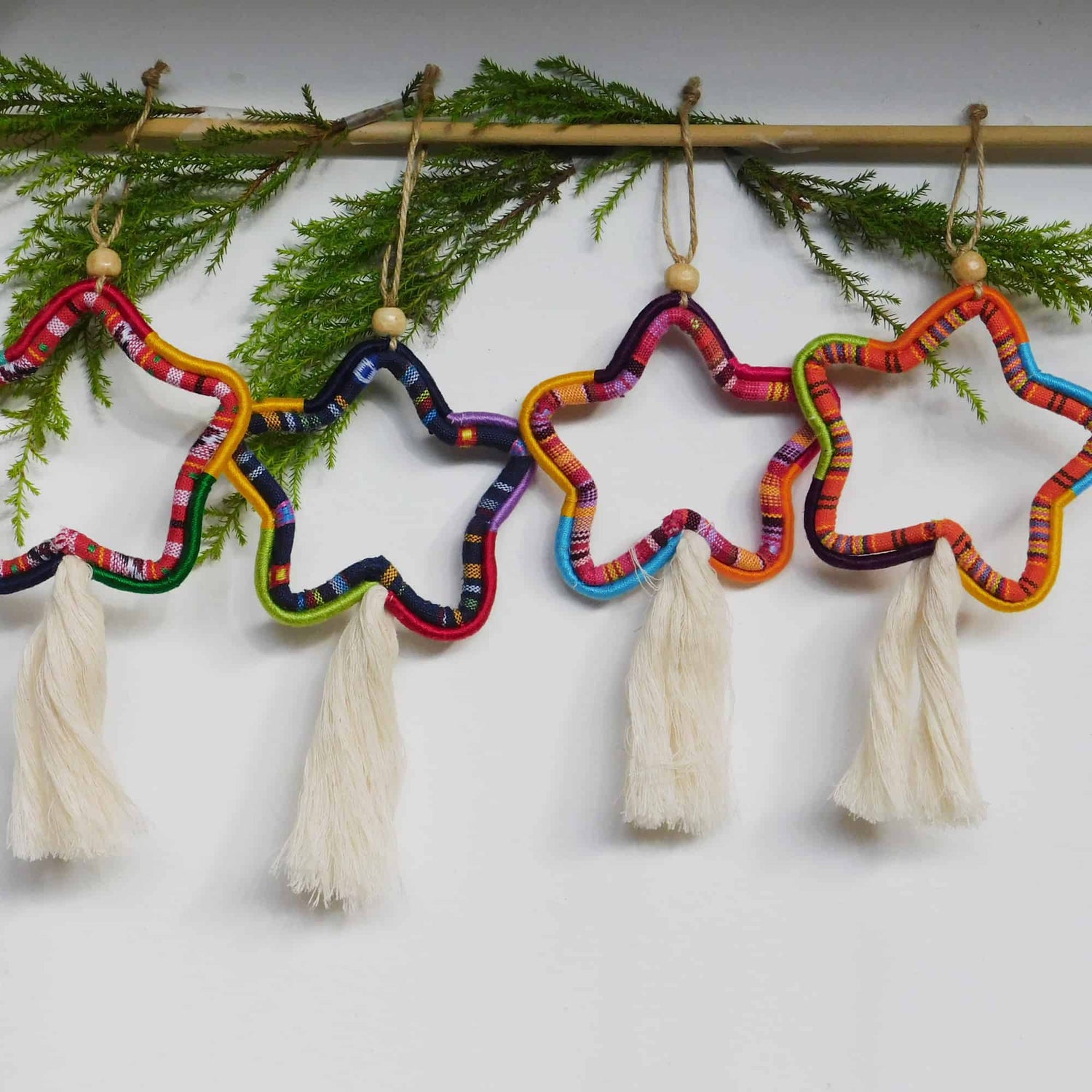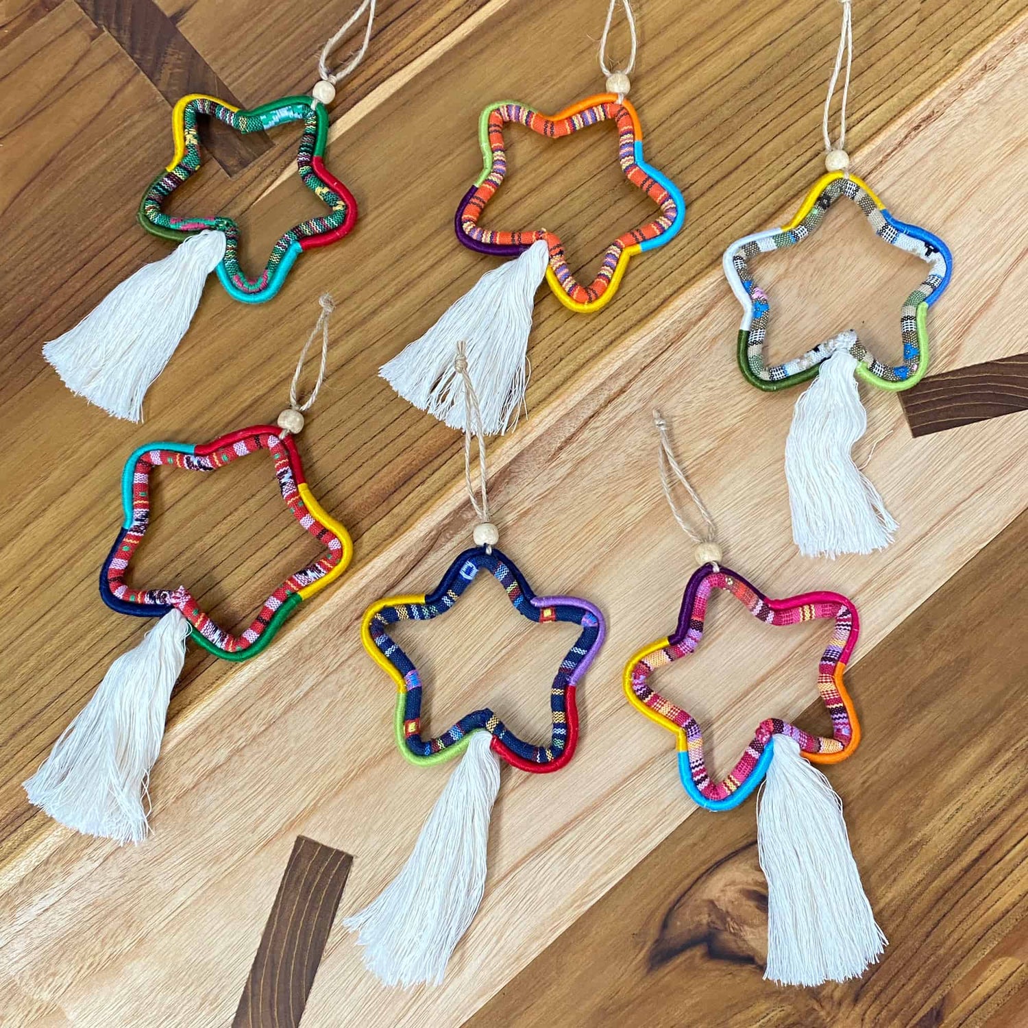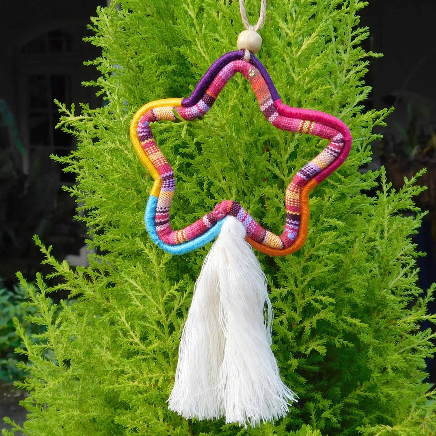 Decora tu arbolito navideño con estos adornos alegres y únicos, con forma de una estrella fugaz con flequitos blancos para darle un toque especial. Fueron elaborados por artesanos aquí en Guatemala usando con un cordón típico en colores variados y un borde hecha de una cuerda de algodón cubierta con sedalina de colores variados.
