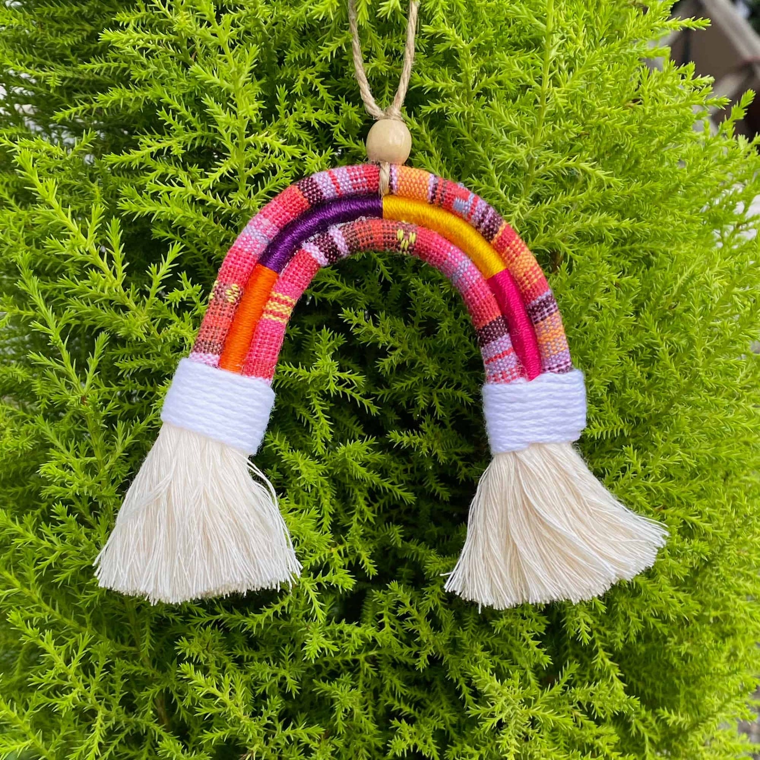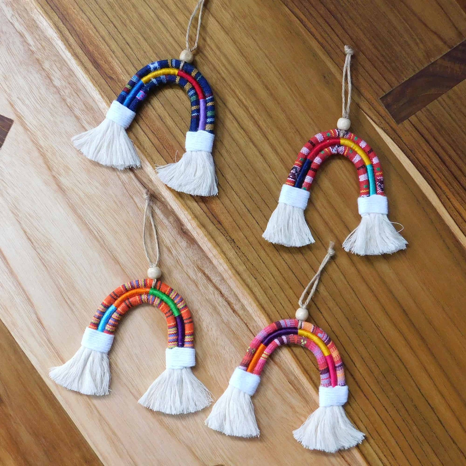 Decora tu arbolito con estos adornos alegres y únicos, en forma de arcoiris y con flequitos blancos para darle un toque especial. Fueron elaborados por artesanos aquí en Guatemala usando algodón blanco cubierto con sedalina de colores variados sobre un cordon típico de algodón.