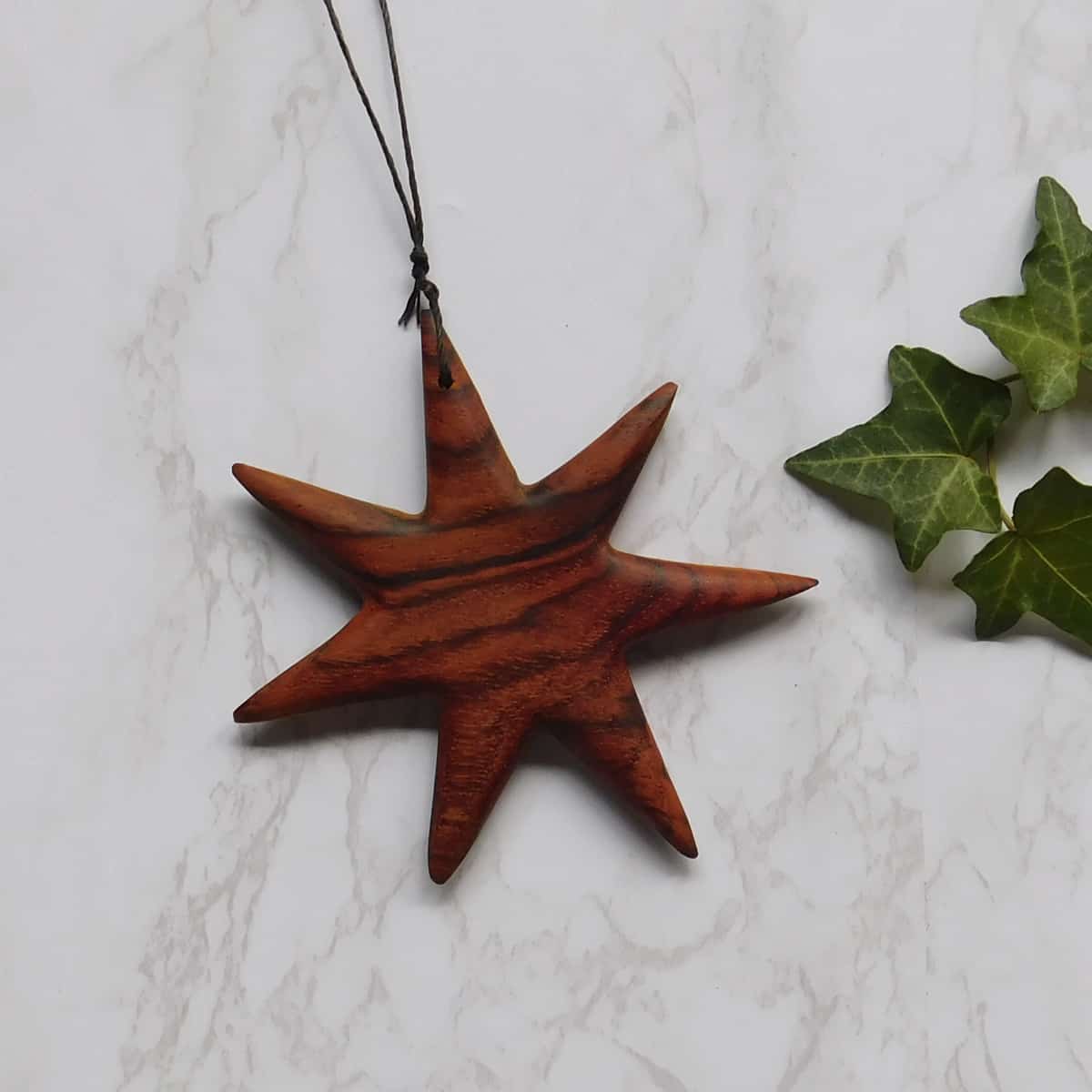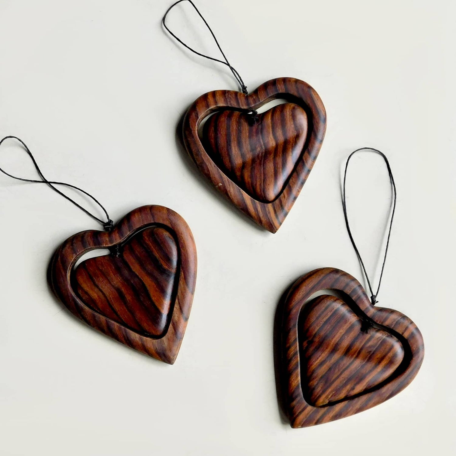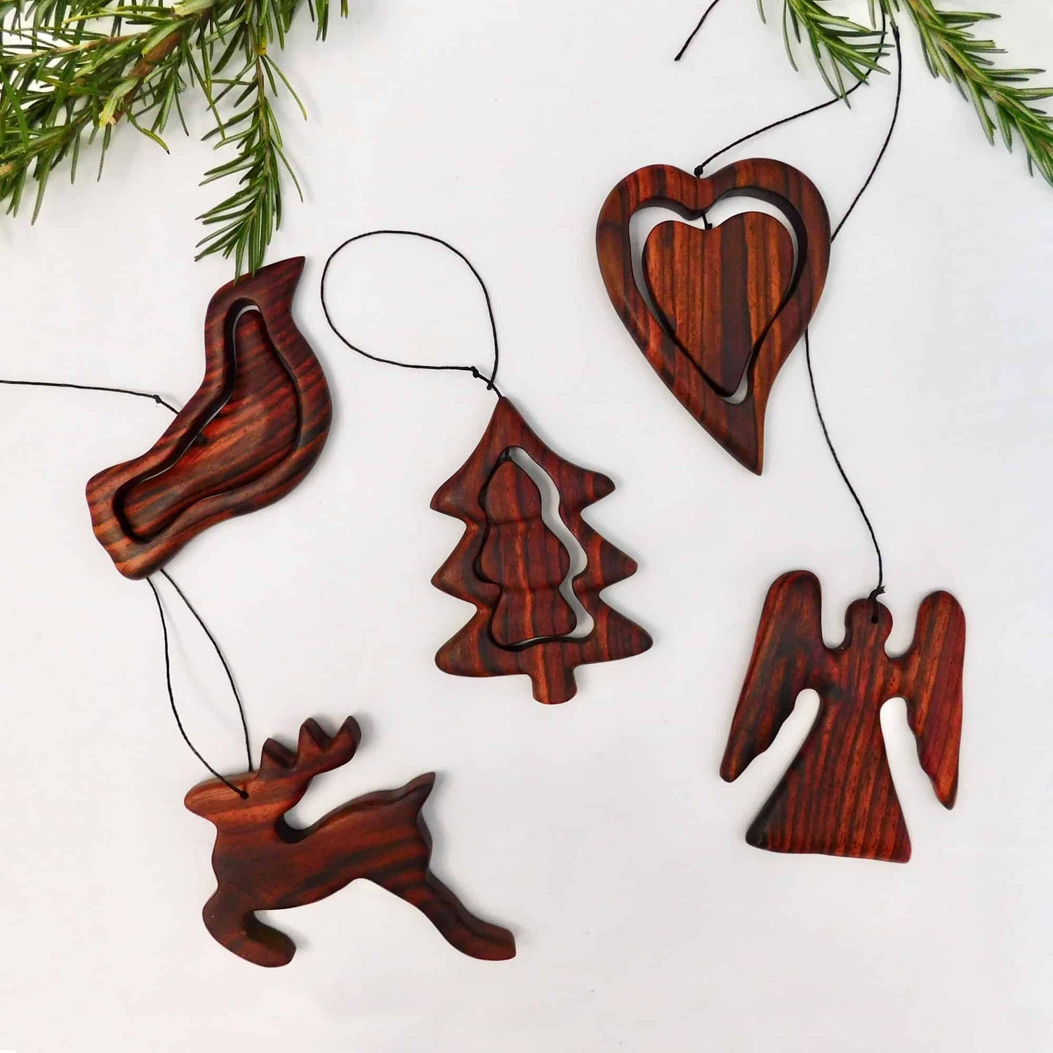 Estos adornos clásicos de madera exquisitamente tallados para la Navidad, que constituyen una elegante adición a tus decoraciones navideñas. Fueron finamente elaborados por un artesano guatemalteco de madera de granadilla, que cuenta con un rico y profundo color marrón. Cada pieza es única, cada uno con una imagen clásica de Navidad. Hay un corazón, una estrella, un pino, una paloma, un reno y un ángel. El corazón, el árbol y la paloma tienen una figura más pequeña rodeada por un contorno de la misma figura, lo que les da una sensación de movimiento inusual y muy hermosa. Los adornos vienen con un fuerte hilo de algodón para colgarlos y son poco pesados, por lo que pueden colgarse fácilmente en un árbol navideño o en una repisa de la chimenea.