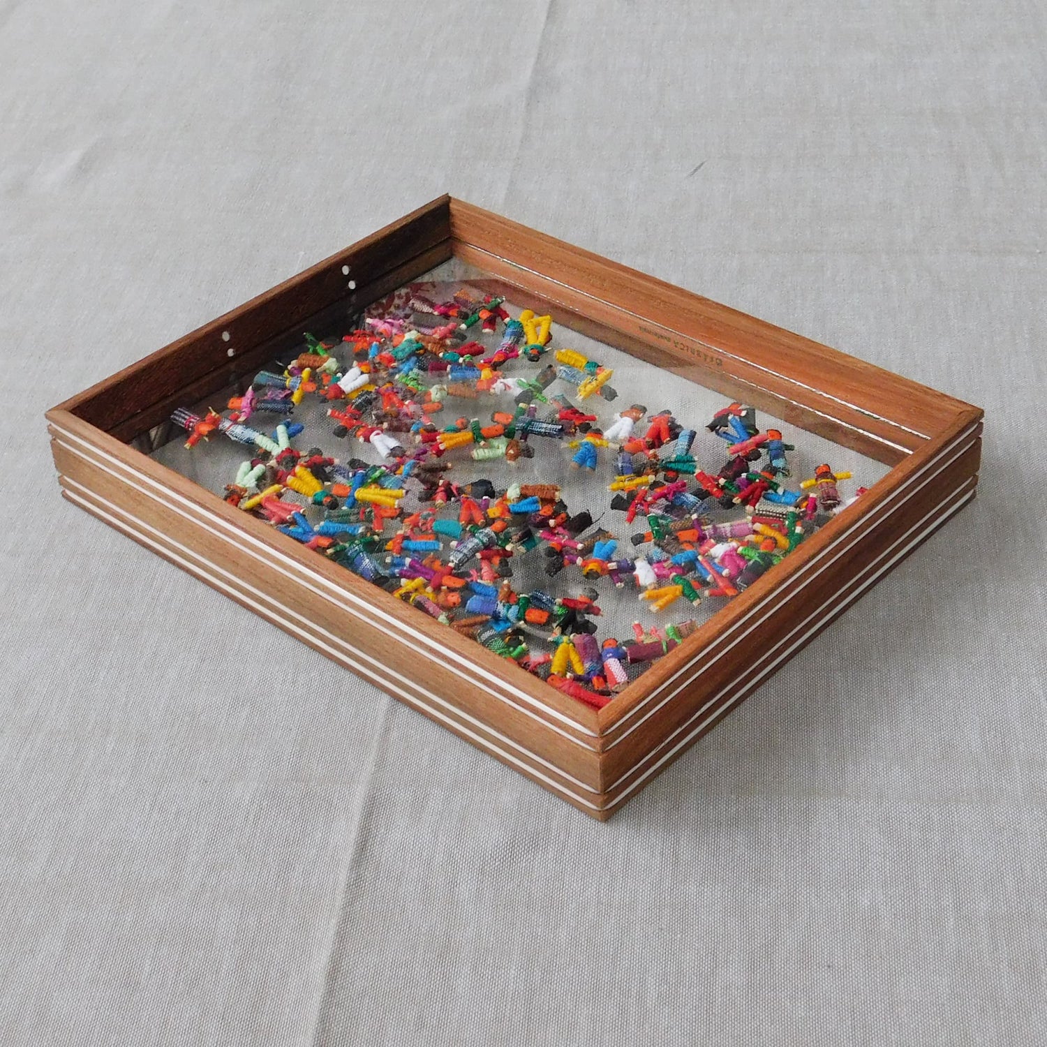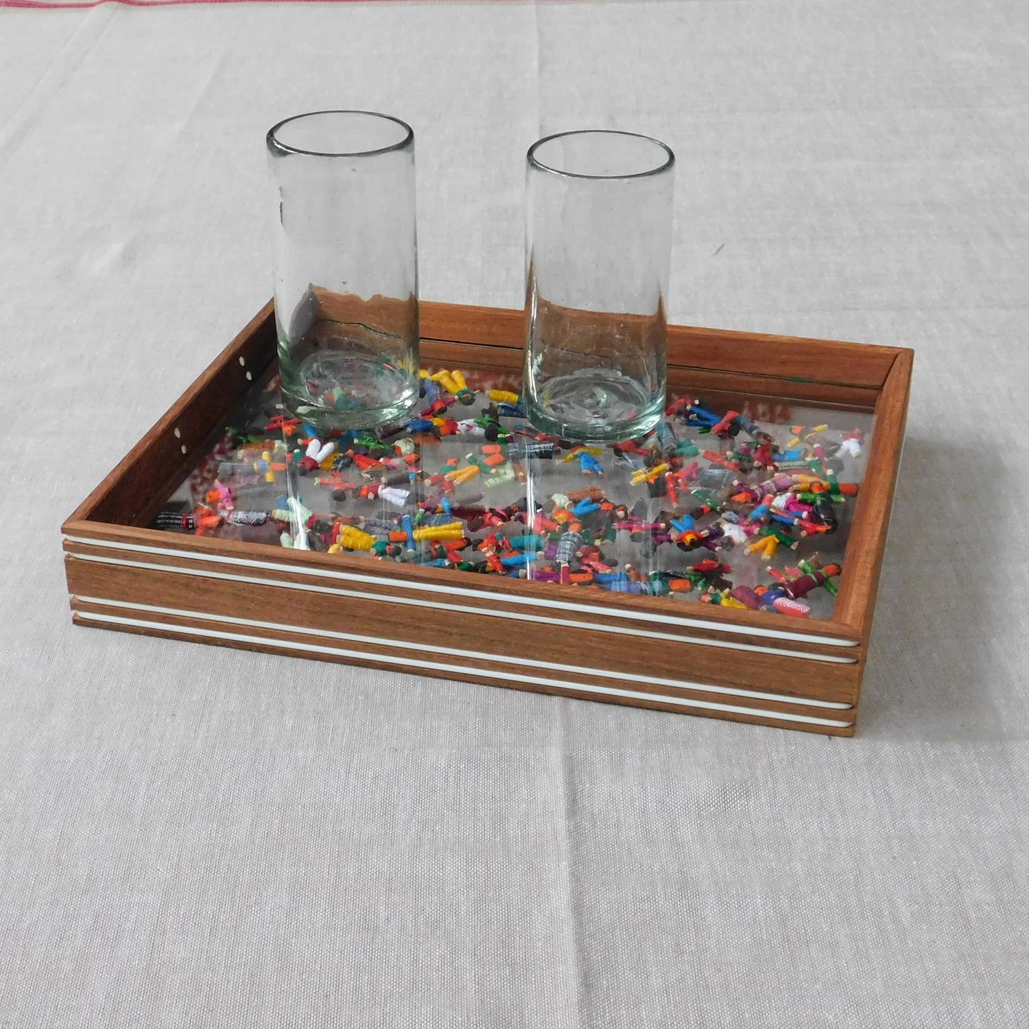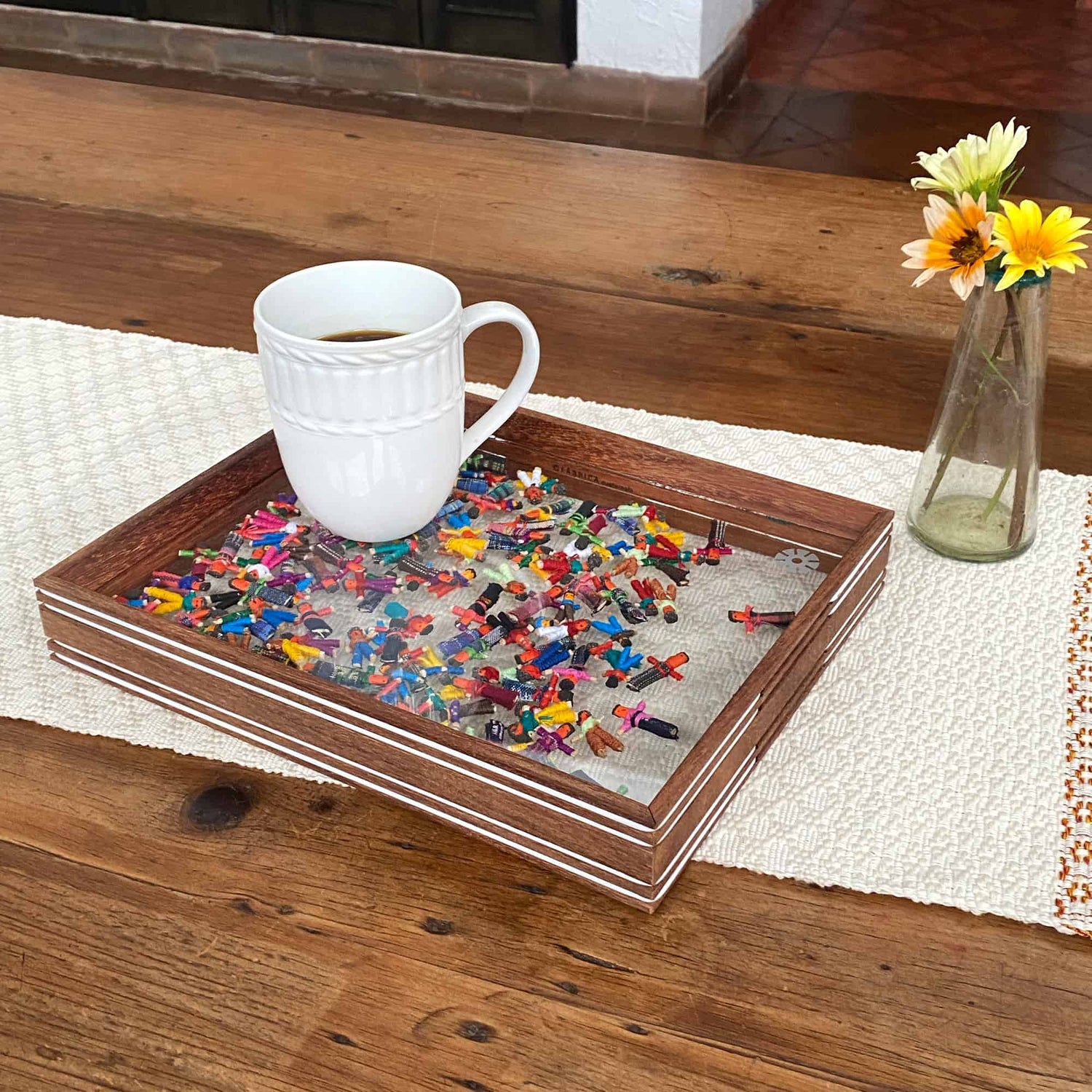 Las muñecas quitapenas son una linda e importante tradición guatemalteca, y estas bandejas las convierten en un divertido y hermoso detalle para tu casa. Ya sea para la cocina, un organizador para tu tocador o para servir café en tu sala de estar, estas bandejas les encantarán a tus invitados. Las quitapenas están sueltas dentro de la bandeja, moviéndose cuando se menea la bandeja. El marco es de maderas tropicales variadas con franjas blancas de plástico. El azafate en sí es de vidrio. Un único detalle para tu hogar.