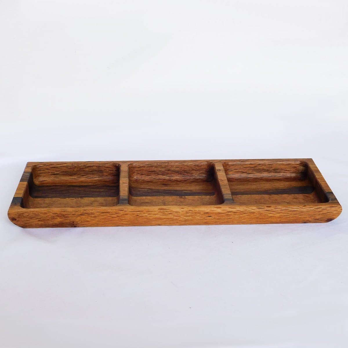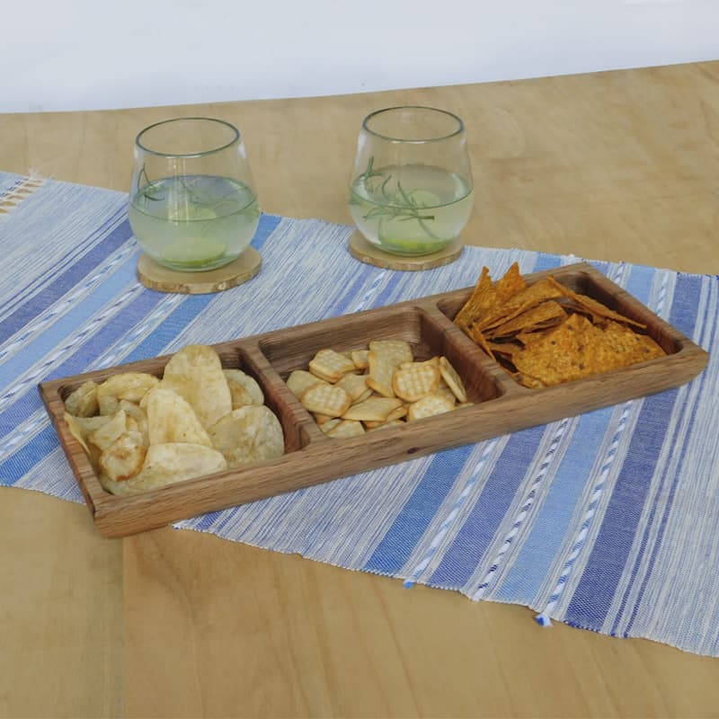 Esta bandeja multiusos con 3 divisiones es un hermoso detalle para tu hogar. Se puede usar para servir diferentes boquitas secas en una cena, para guardar llaves u otros objetos al entrar a la casa, o incluso para guardar joyería. Tiene una multitud de usos y además es bello, permitiendo que luzcan las naturales vetas de la madera roble. Se puede combinar también con nuestra bandeja con 2 divisiones, para crear un "look" completo.