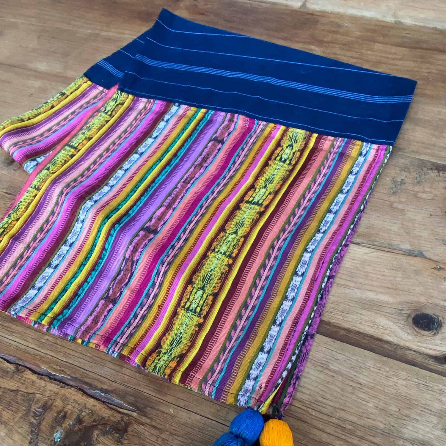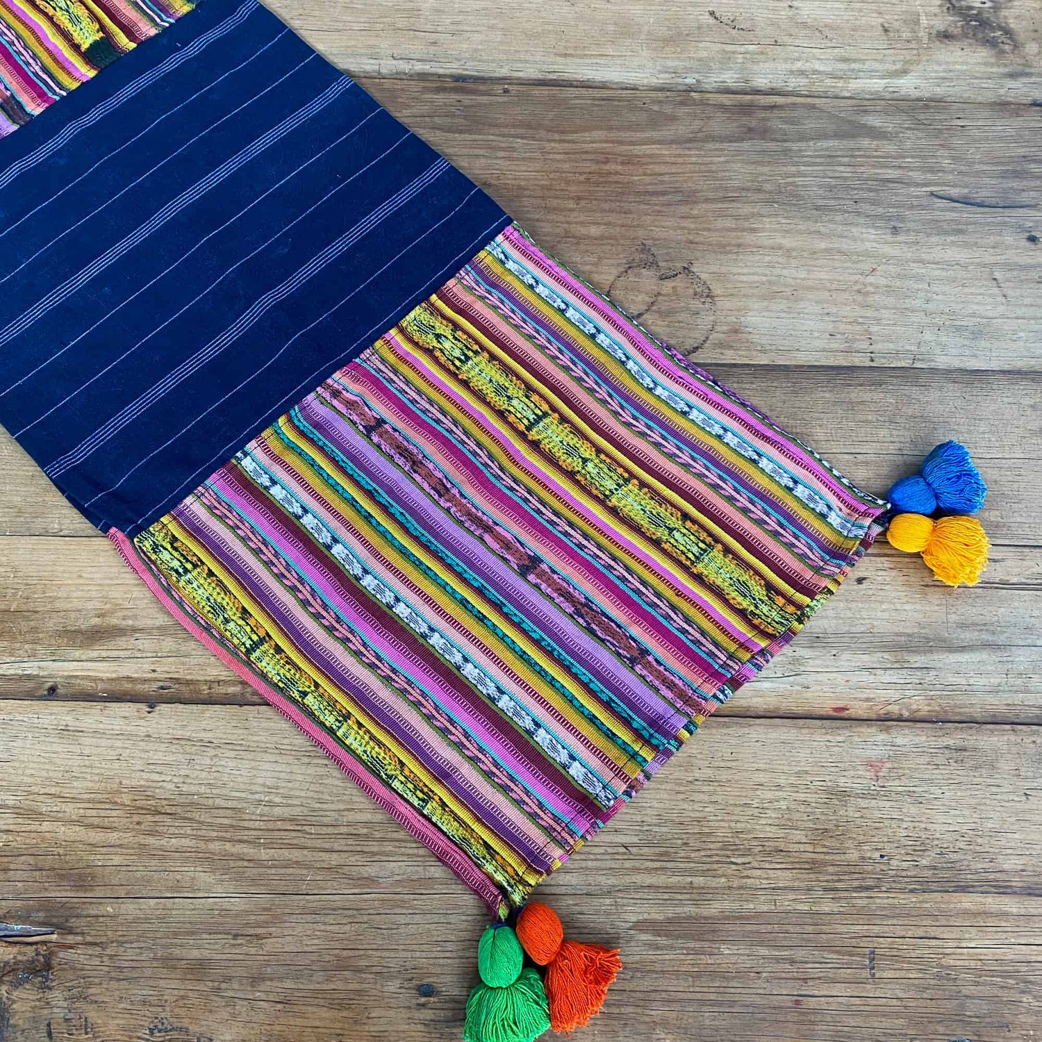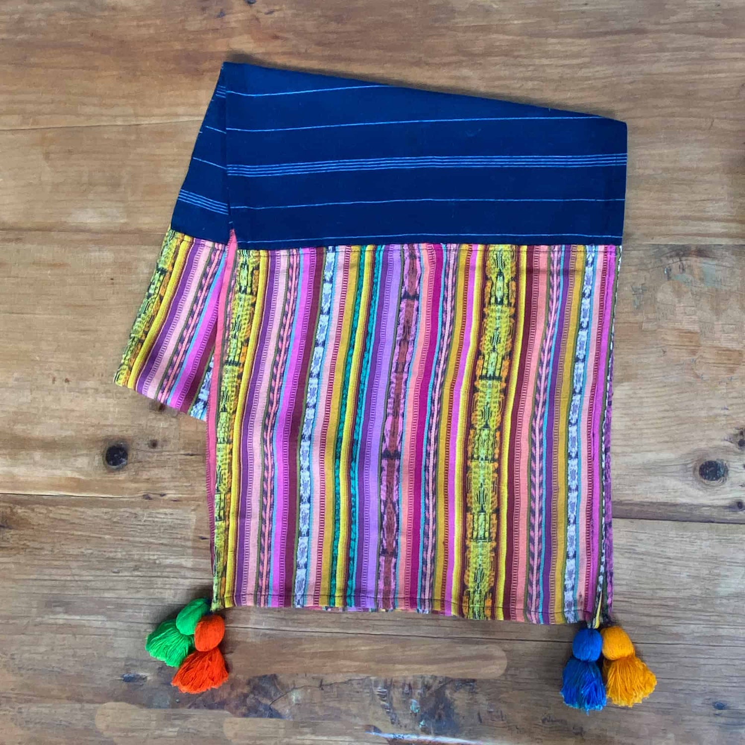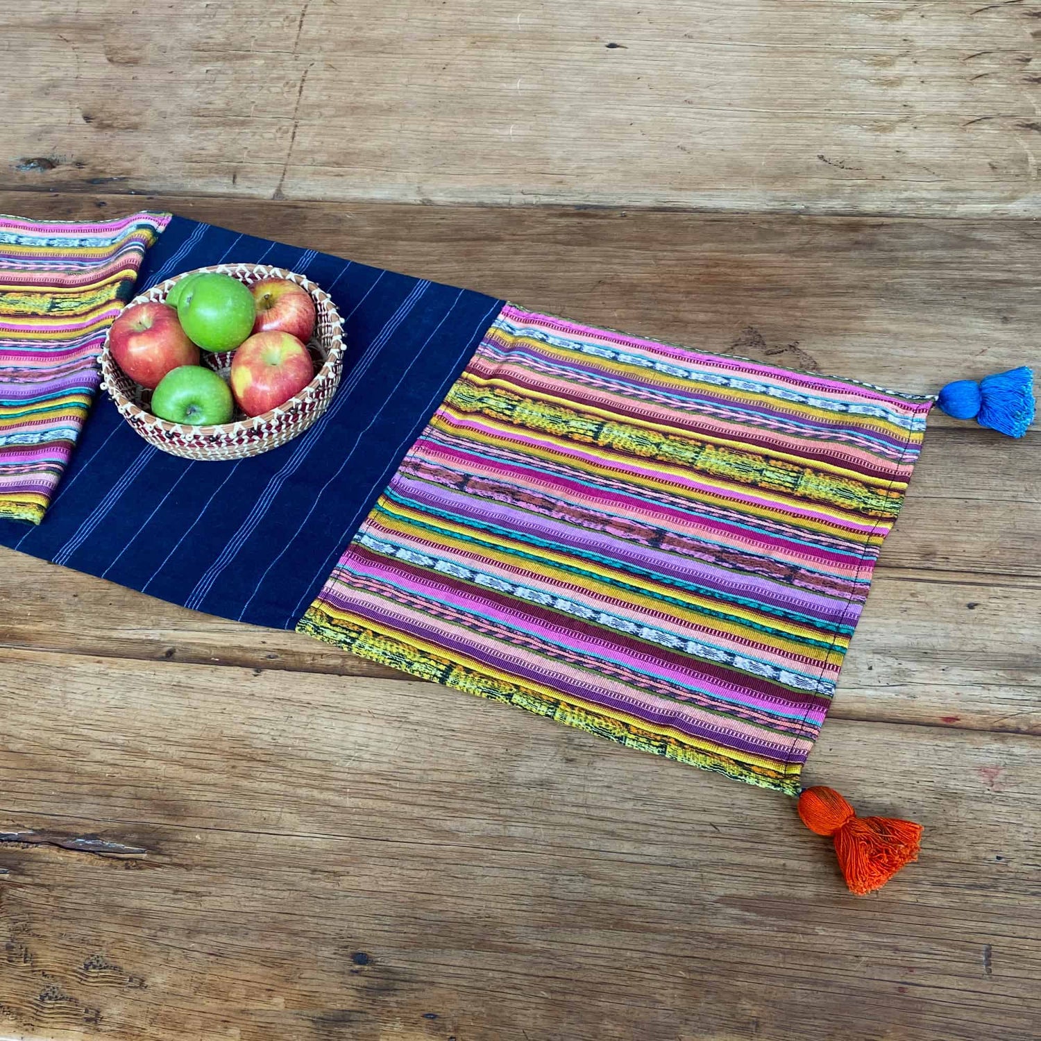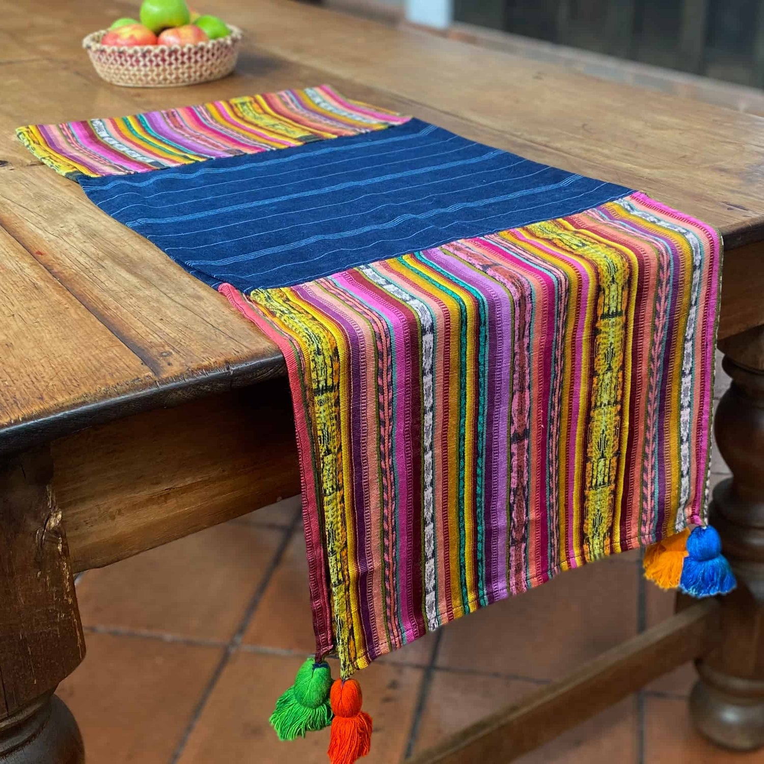 Este hermoso y colorido camino de mesa de algodón es perfecto para cualquier mesa. Sus colores alegres y la combinación de cortes típicos con cortes azules lo hacen un detalle decorativo único. Lleva un pompón en cada esquina. Los colores de los cortes típicos varían, al igual que las franjas decorativas, por ser producto hecho 100% a mano. Contáctanos para conocer los colores disponibles.