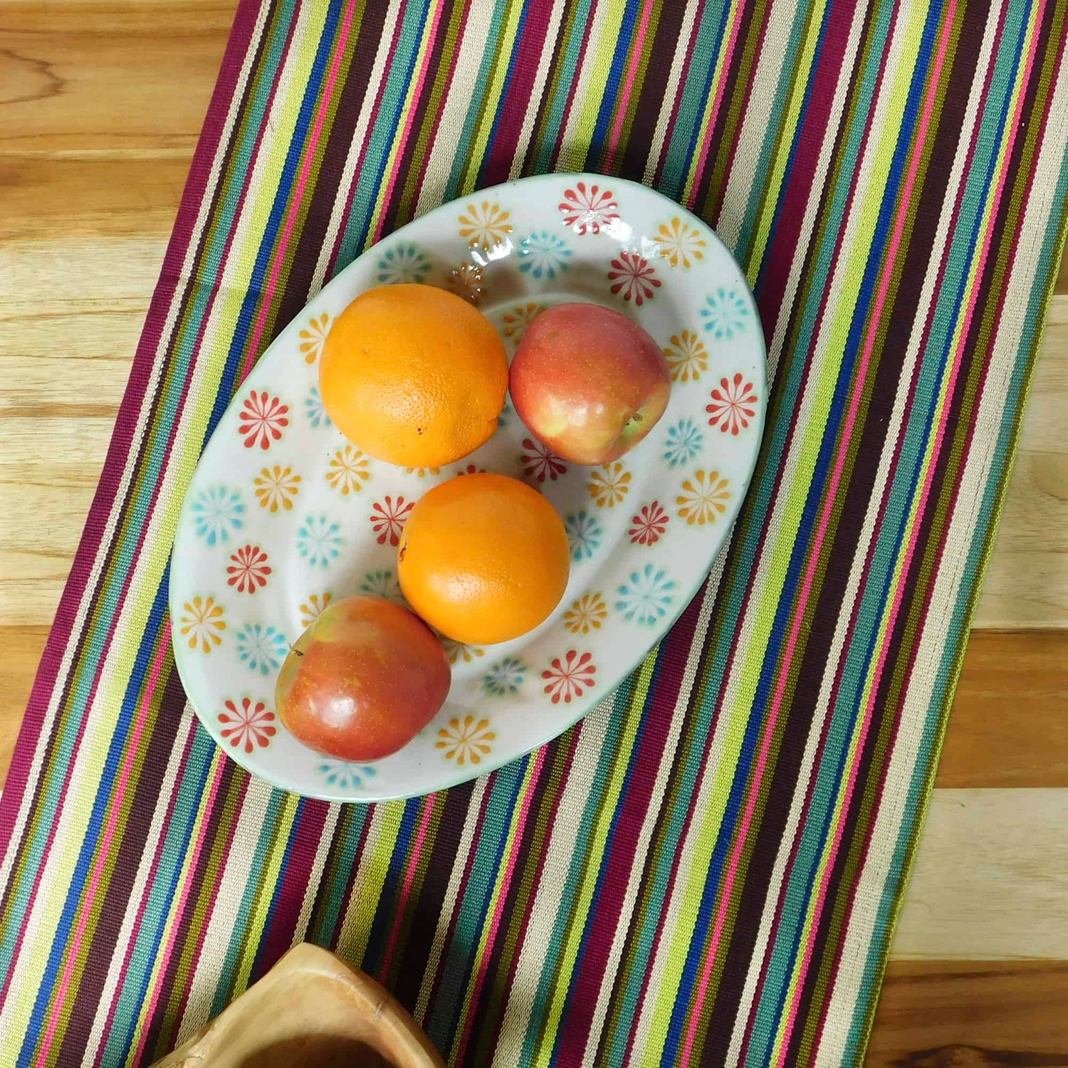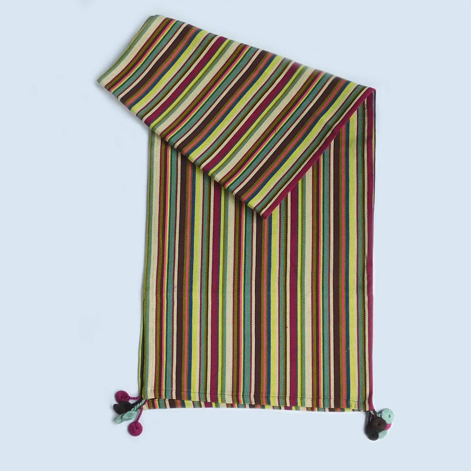 Trae color y alegría a tu mesa con estos caminos de mesa. La tela fue tejida de algodón en telar de pie y luego un costurero en Antigua hizo los caminos. Tiene rayas de distintos anchos en muchos diferentes colores, incluyendo burdeos, café, crema, azul marino, fucsia, azul marino, turquesa, berenjena y verde claro. Para un detalle decorativo, también lleva 3 discos de colores de la tela en cada extremo.