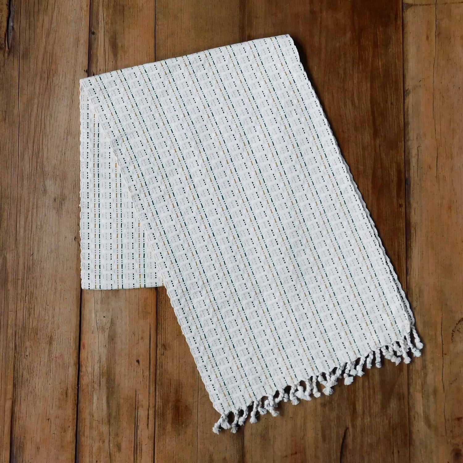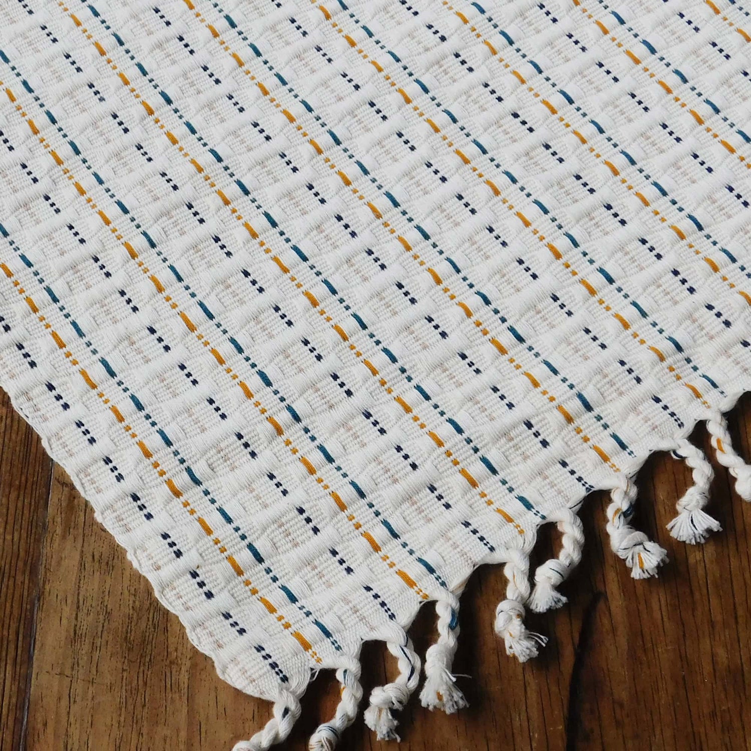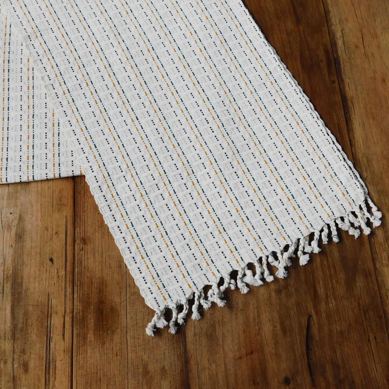 Este camino de mesa Panalito es una pieza de decoración elegante y hermosa, elaborada con 100% algodón por talentosas artesanas. Las franjas en mostaza, verde sipson y azul oscuro junto con la base blanca cruda le dan un toque de color a tu mesa. Además de ser duradero y reutilizable, cuenta con flecos decorativos que lo hacen aún más especial. Un complemento perfecto para cualquier ocasión.