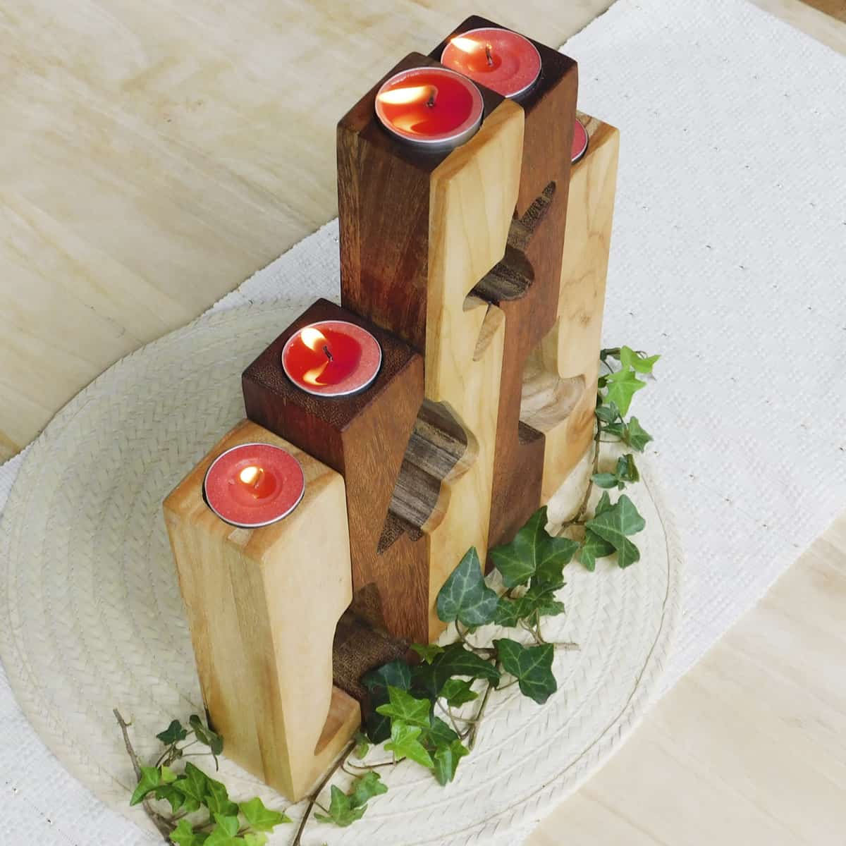 Cada candelero tiene recortada la mitad de una forma navideña (una bota, una campana, una estrella y un pino). Cuando los candeleros se colocan con los demás, estas medias formas se convierten en formas completas. Además, los candeleros alternan entre la madera clara y la oscura una vez que se colocan juntos, lo que hace que sea un conjunto llamativo que sin duda recibirá cumplidos. Serían ideales para las velas de Hanukkah o Navidad, ya que simbolizan la cercanía que todos sentimos aunque a veces no podamos estar físicamente juntos.