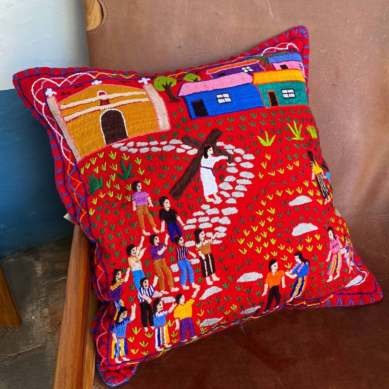 Esta única funda de cojín representa escenas de las famosas procesiones de la Semana Santa en Guatemala. Fue tejida y luego bordada por una cooperativa de artesanas guatemaltecas. Le decimos “La Funda Cuenta Historias,” porque realmente es una pieza de la historia de Guatemala. Hecho 100% de algodón, a nuestras artesanas les tomó más de veinticuatro horas completar esta increíble obra de arte con los coloridos detalles de estas escenas tradicionales. ¡Decora tu casa esta Semana Santa con esta hermosa funda!