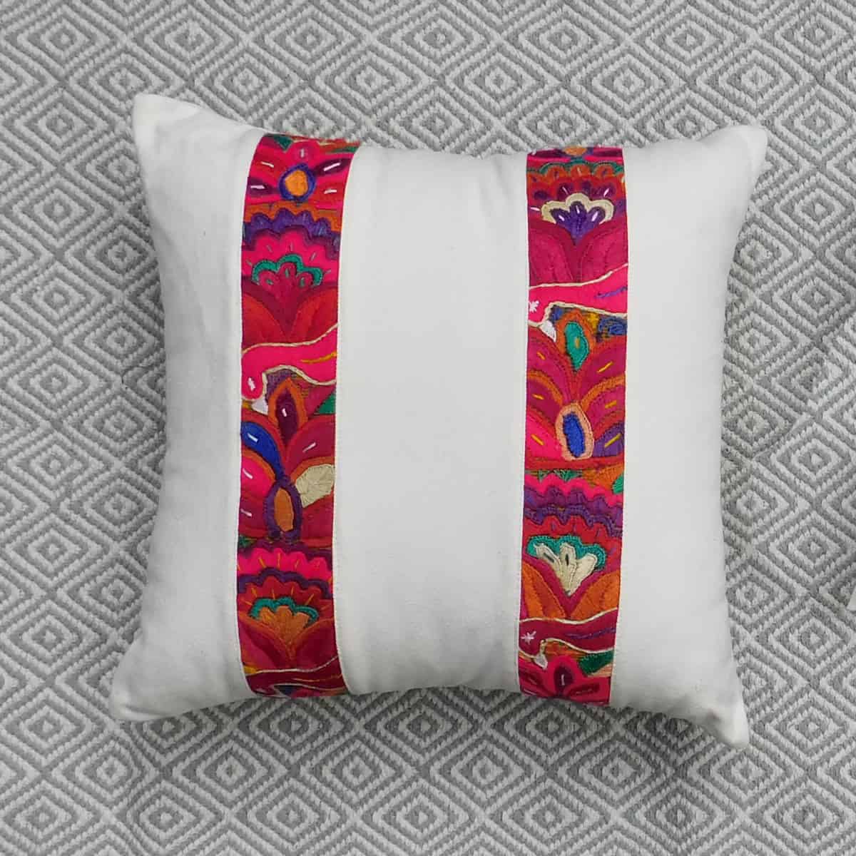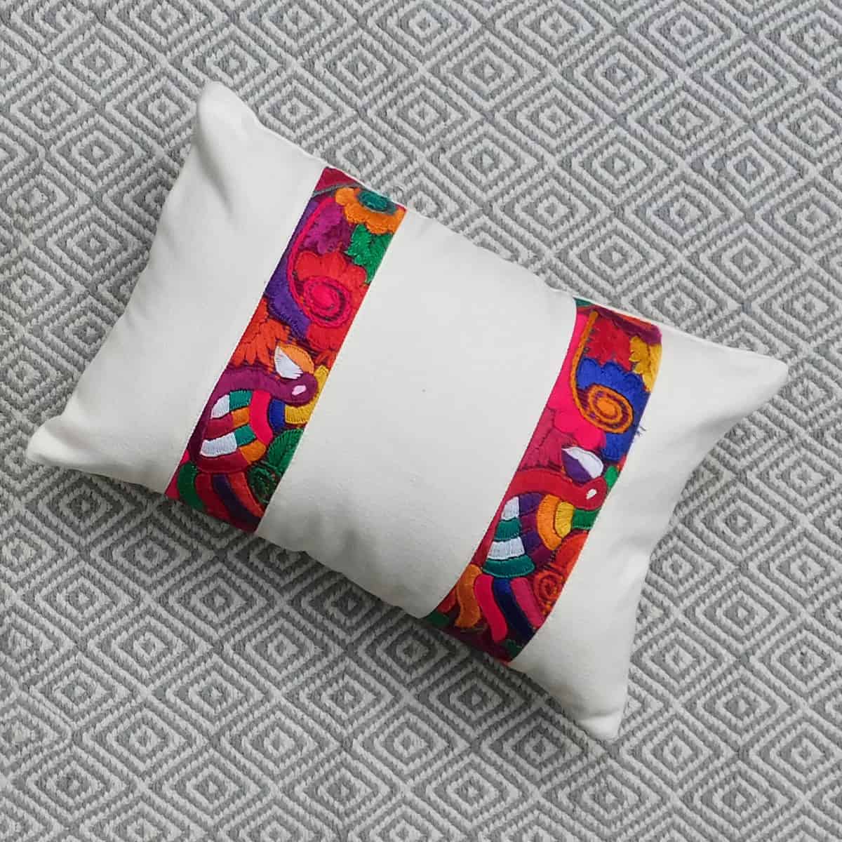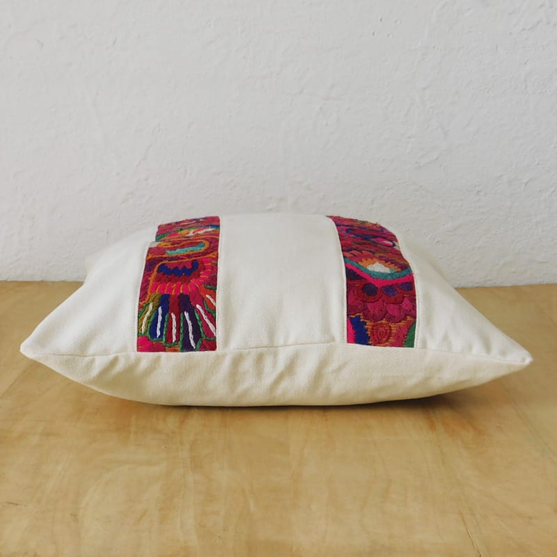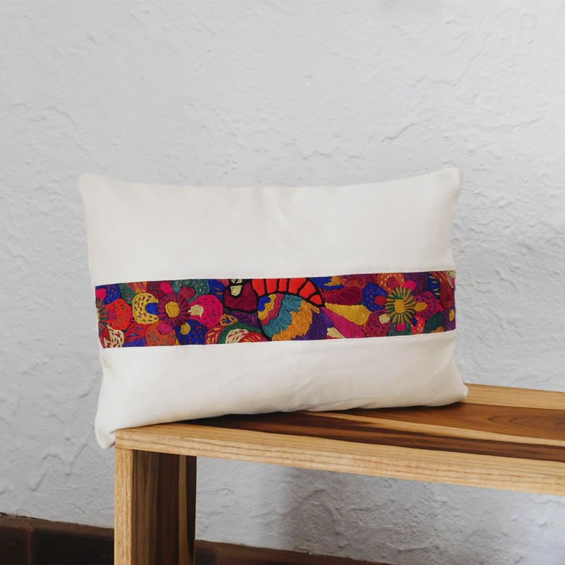 Estas hermosas fundas decorativas de cojines llevan un fondo blanco tejido de algodón crudo y fajas bordadas con diseños florales y geométricos que le dan un toque de color. Los colores vivos y los diseños nos recuerdan a las selvas vibrantes de Guatemala y su hermosa flora y fauna, así que las llamamos las Nubes de la Jungla. Un acento decorativo único, elegante y bello, elaborado a mano utilizando 100% algodón para el fondo y sedalina para la faja bordada. Disponible en dos tamaños: cojín lumbar y cuadrado.