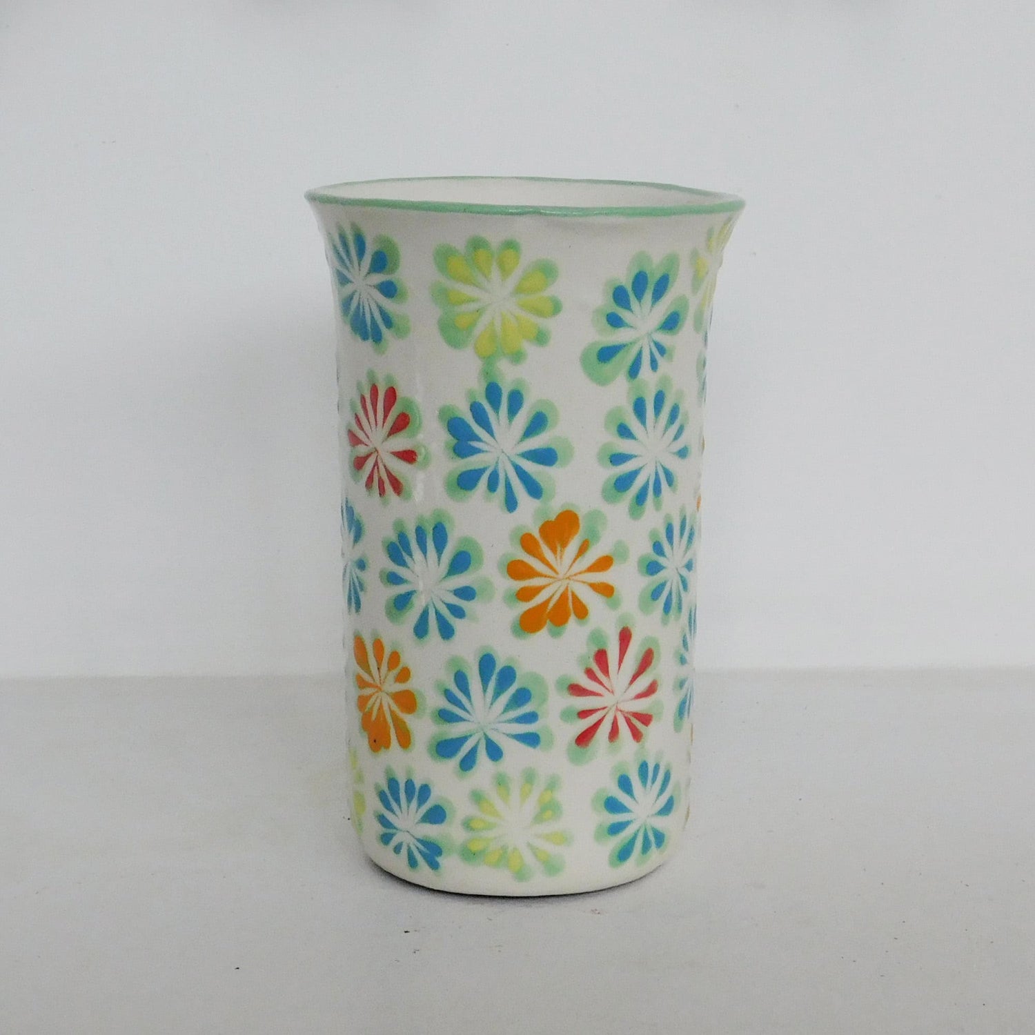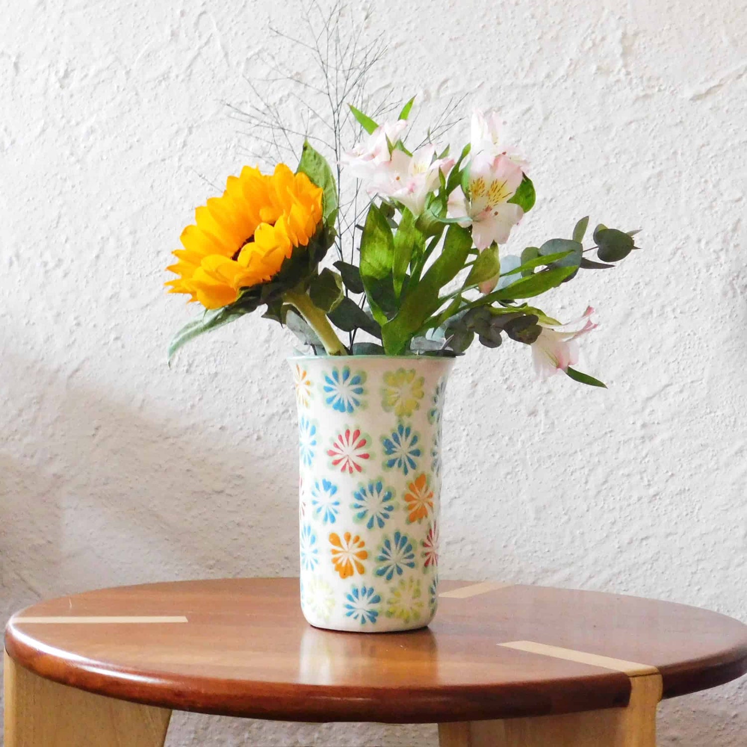 Alegra cualquier espacio con un arreglo hermoso de flores en un florero colorido de cerámica. Nuestro florero alto es una pieza elegante y pintoresca, y sería la decoración perfecta para el Día de la Madre u otro día especial.