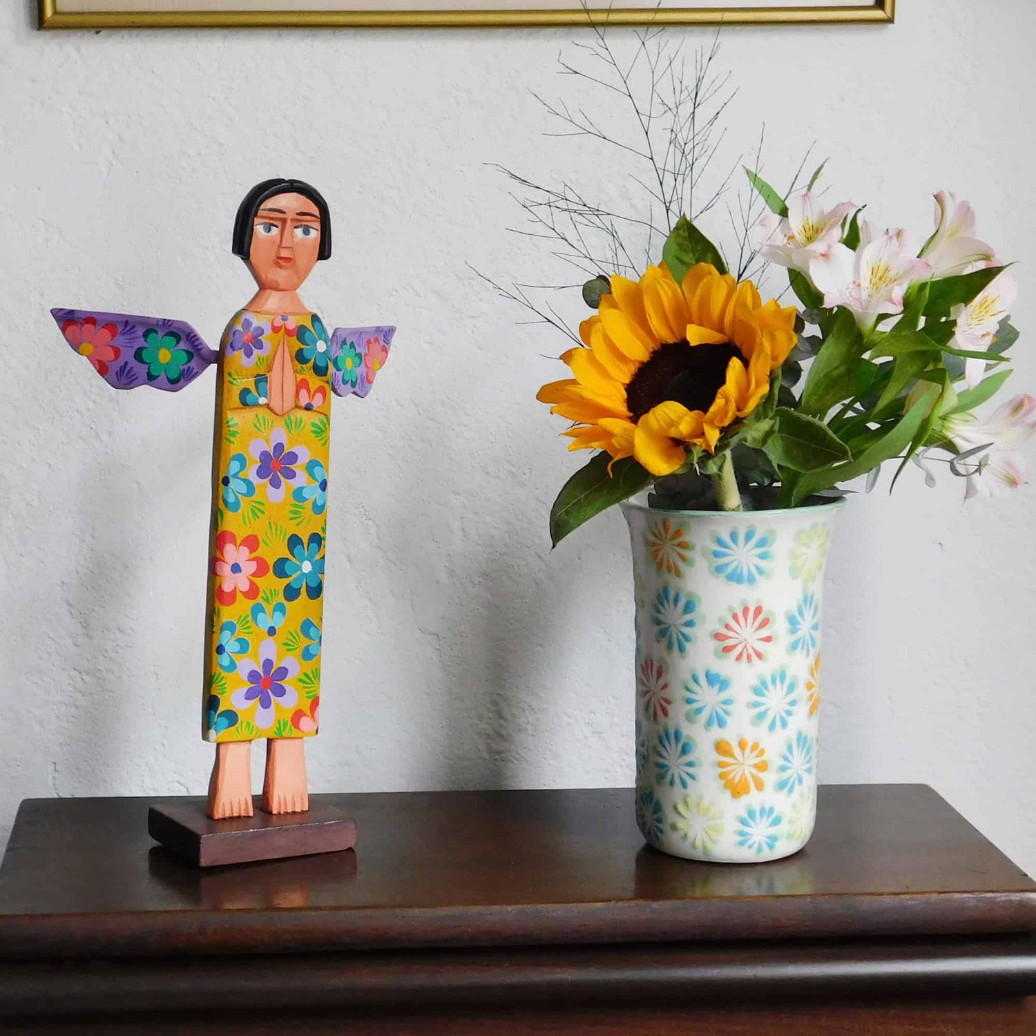 Los coloridos diseños de flores pintados en verde, azul, anaranjado y rojo le darán un toque especial a cualquier lugar. El florero fue elaborado y pintado a mano por artesanos guatemaltecos.