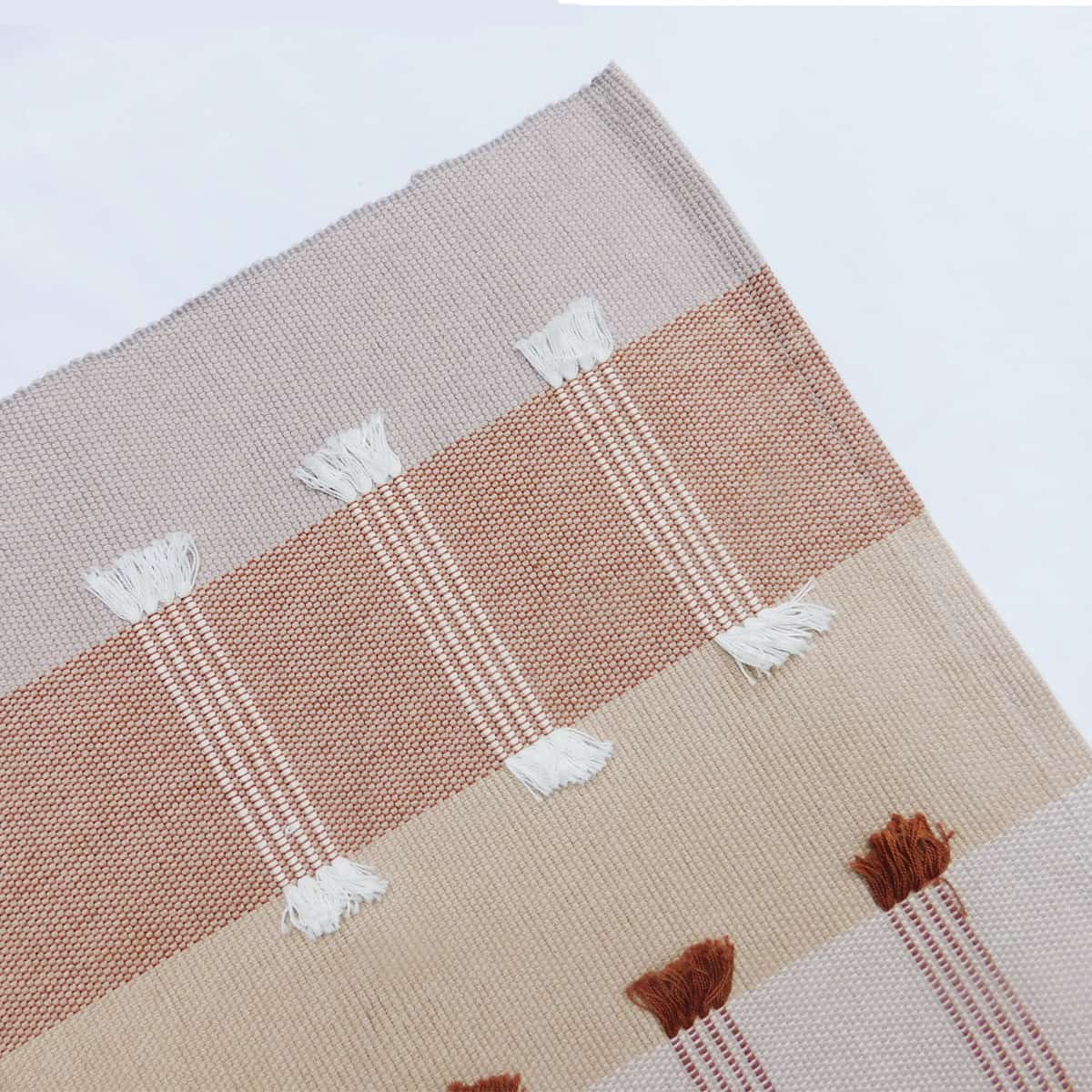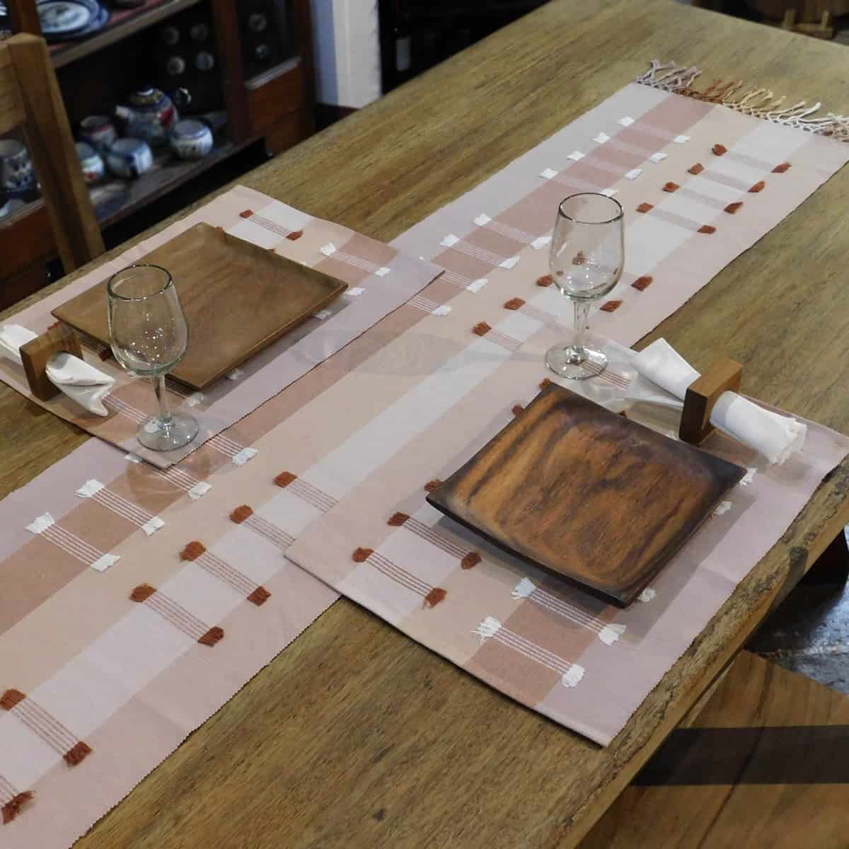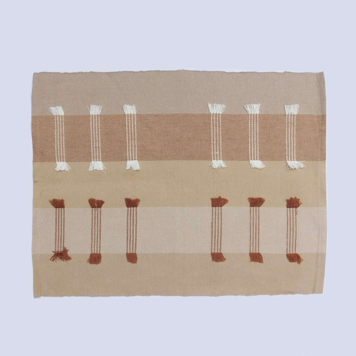 Este hermoso individual fue tejido en Comalapa con algodón de alta calidad. La tejedora usa un telar de cintura para crear impresionantes piezas que aportarán elegantes tonos tierra a tu mesa. Cada individual tiene flecos en blanco y café que le dan una textura única, divertida y sofisticada. Esta colección de individuales se pueden usar a diario o para reuniones especiales.