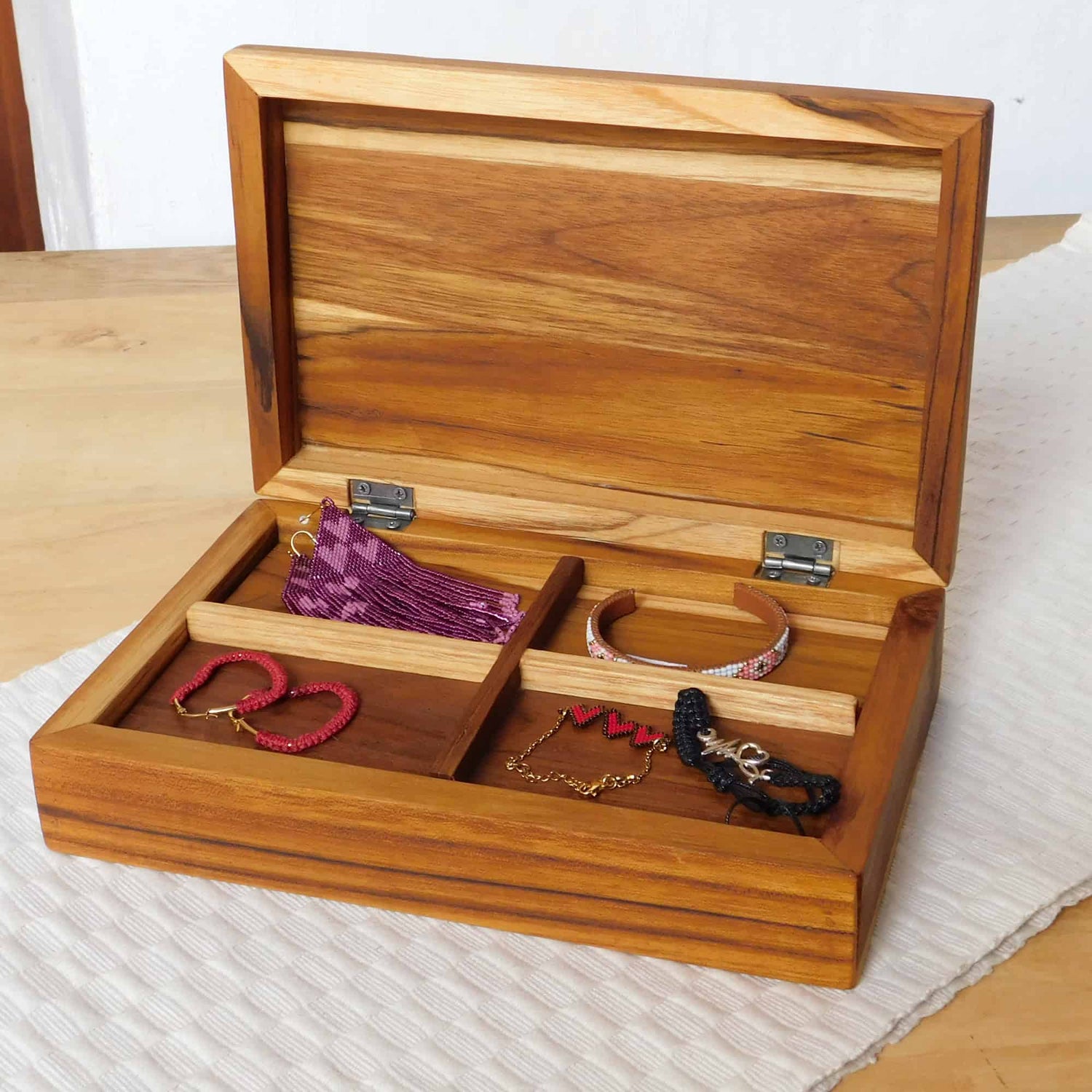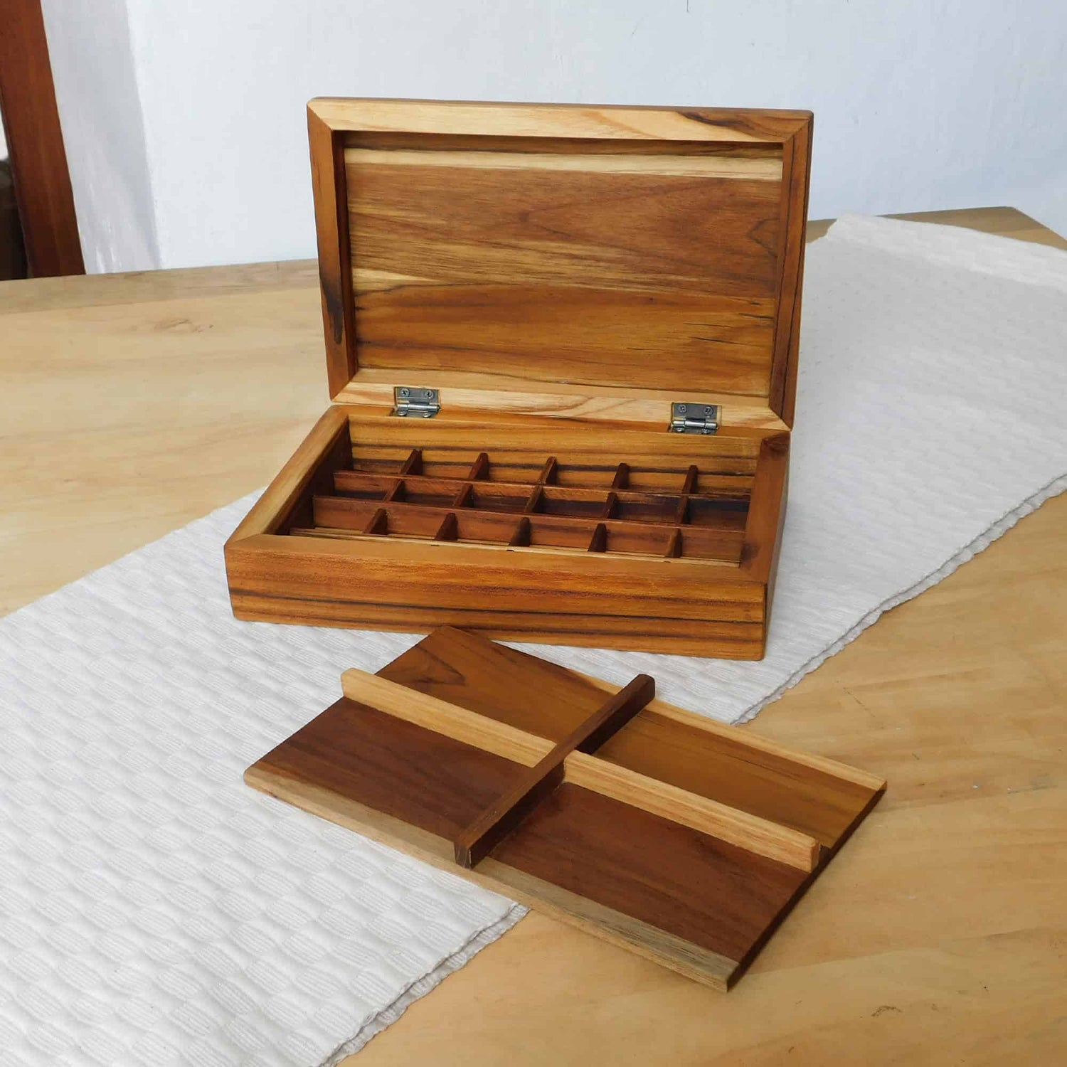 Nuestro joyero de madera teca es una pieza elaborada a mano, duradera y hermosa, que además de organizar tus joyas, es un elemento decorativo perfecto para tu hogar. Con pequeños espacios en la parte inferior y un azafate superior removible con 4 divisiones, podrás tener todo en su lugar de manera funcional y elegante.