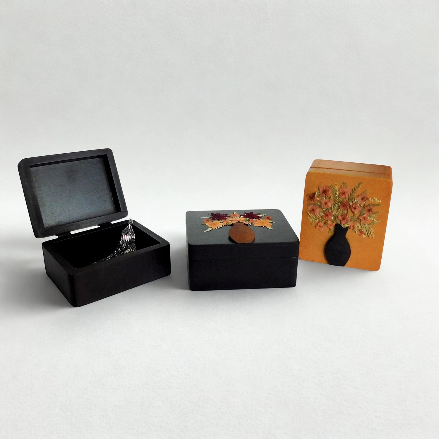 Este joyero de madera es tu aliado secreto para mantener tus joyas organizadas con estilo. Adornado con flores secas y fibra de morro en una paleta de colores variados, cada caja cuenta su propia historia artesanal. Ideal para guardar anillos, aretes y pulseras mientras decoras tu mesita de noche con un toque bohemio y natural. ¡Funcionalidad y belleza en una sola pieza!