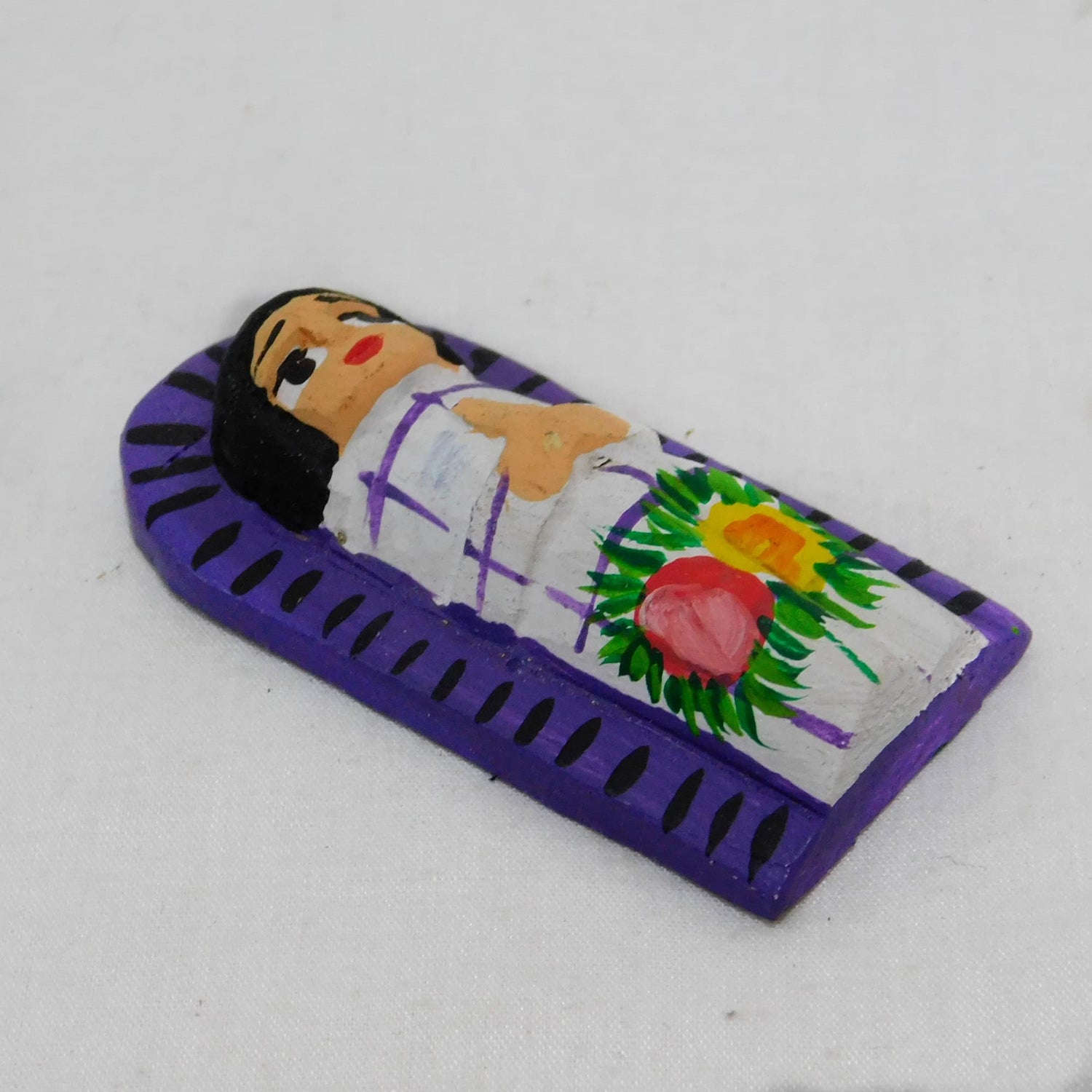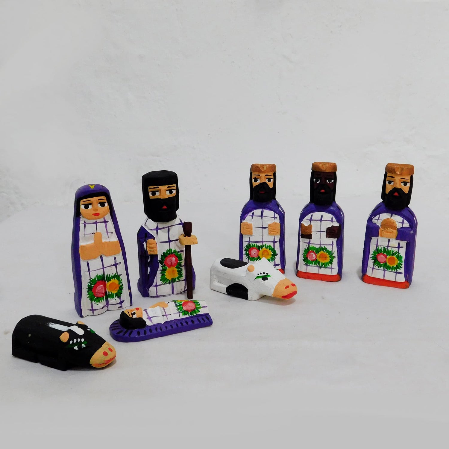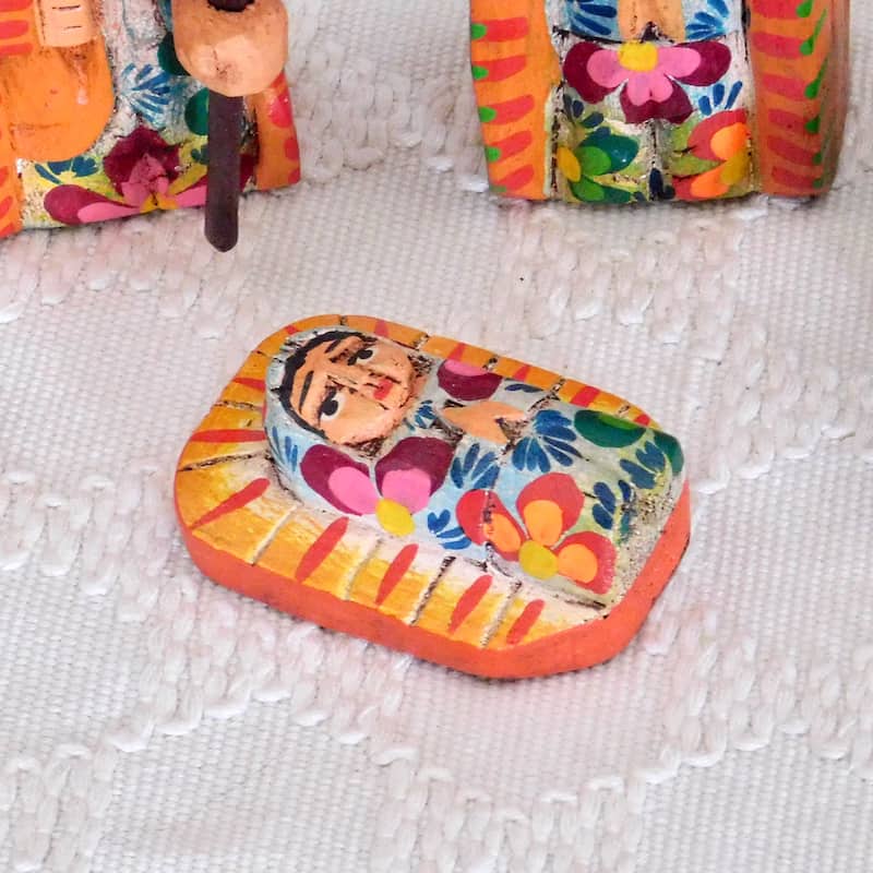 Este nacimiento de madera fue tallado a mano en madera de pino y pintado con flores coloridas y diseños de vestimentas mayas tradicionales por un talentosos artesanos guatemaltecos. Es de 10 cm de altura, ligero y duradero.