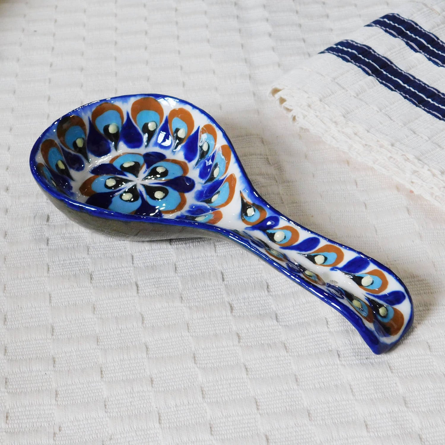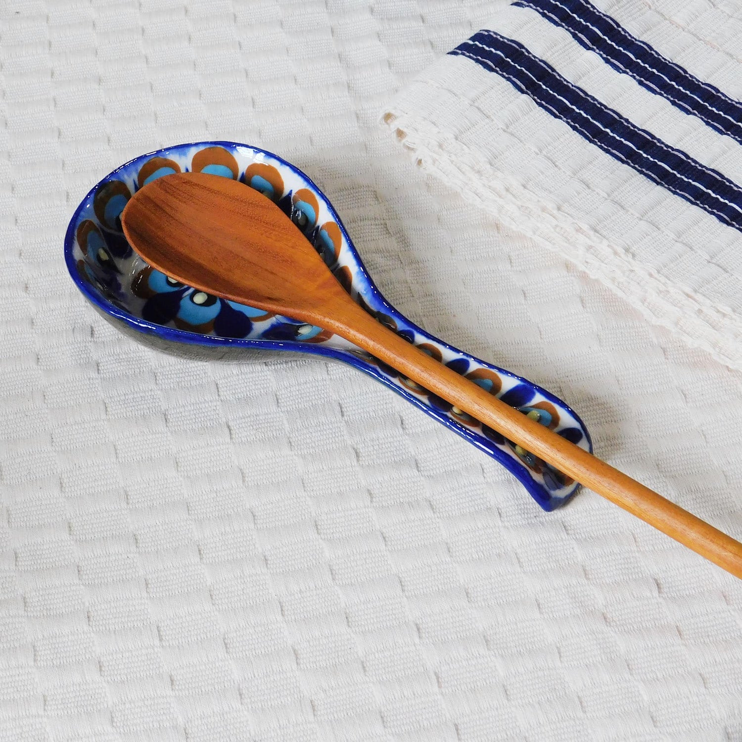 Este porta cuchara de cerámica, decorado con un elegante diseño de gotas en tonos azules y turquesa, es la pieza perfecta para mantener tu cocina organizada y estilizada. Hecho a mano con cuidado y esmero, combina funcionalidad y arte, aportando un toque único a tu espacio mientras protege superficies de salpicaduras y manchas. Ideal para quienes valoran la calidad artesanal y desean un detalle práctico con encanto visual.