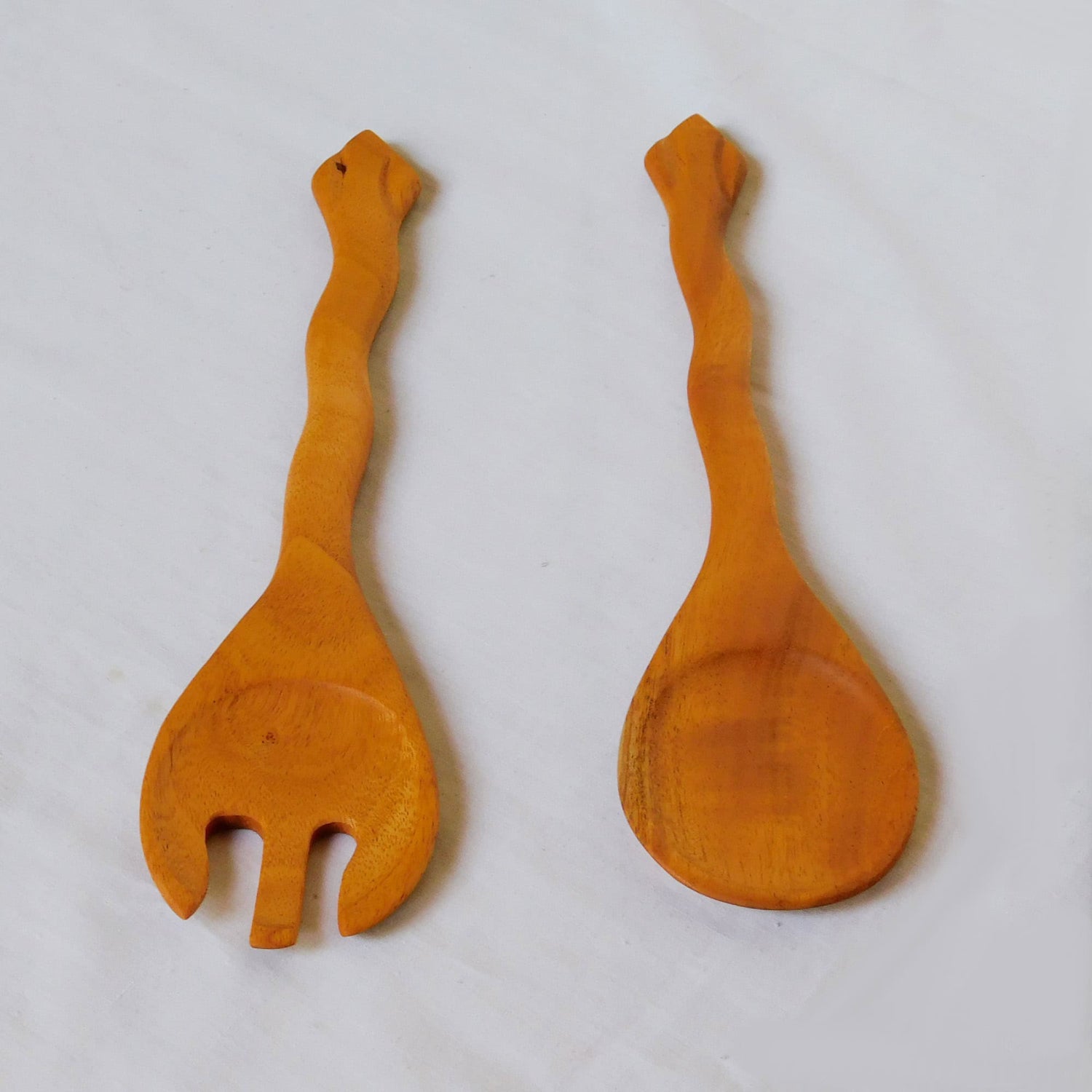Este set de cucharas ensaladeras está cuidadosamente elaborado a mano con madera natural, ofreciendo un toque artesanal y único en cada pieza. Su diseño con mango en forma de serpiente no solo aporta estilo y elegancia a tu mesa, sino que también facilita el agarre para servir ensaladas con comodidad. Ideal para quienes valoran la combinación de funcionalidad y arte en utensilios de cocina, este set es perfecto para realzar tus momentos de comida con un detalle distintivo y duradero.