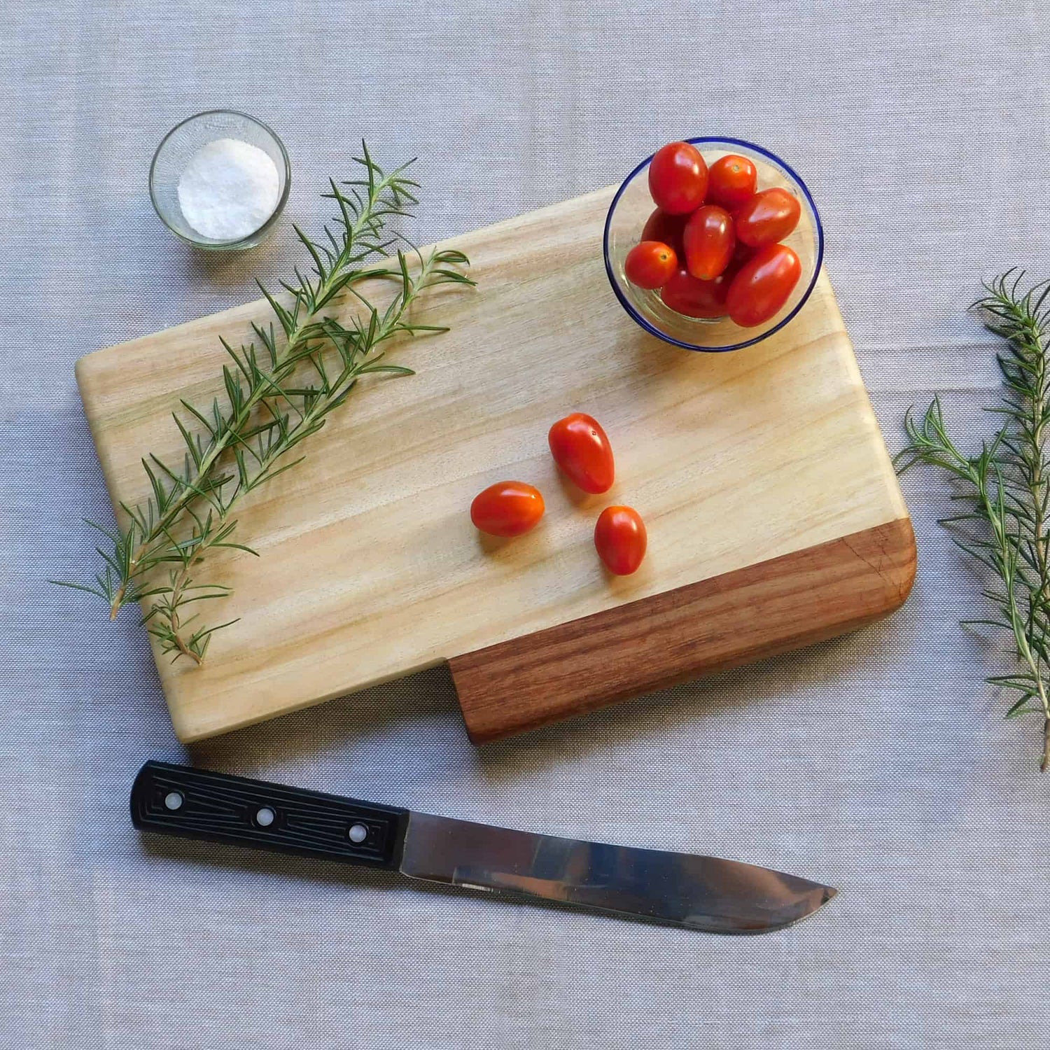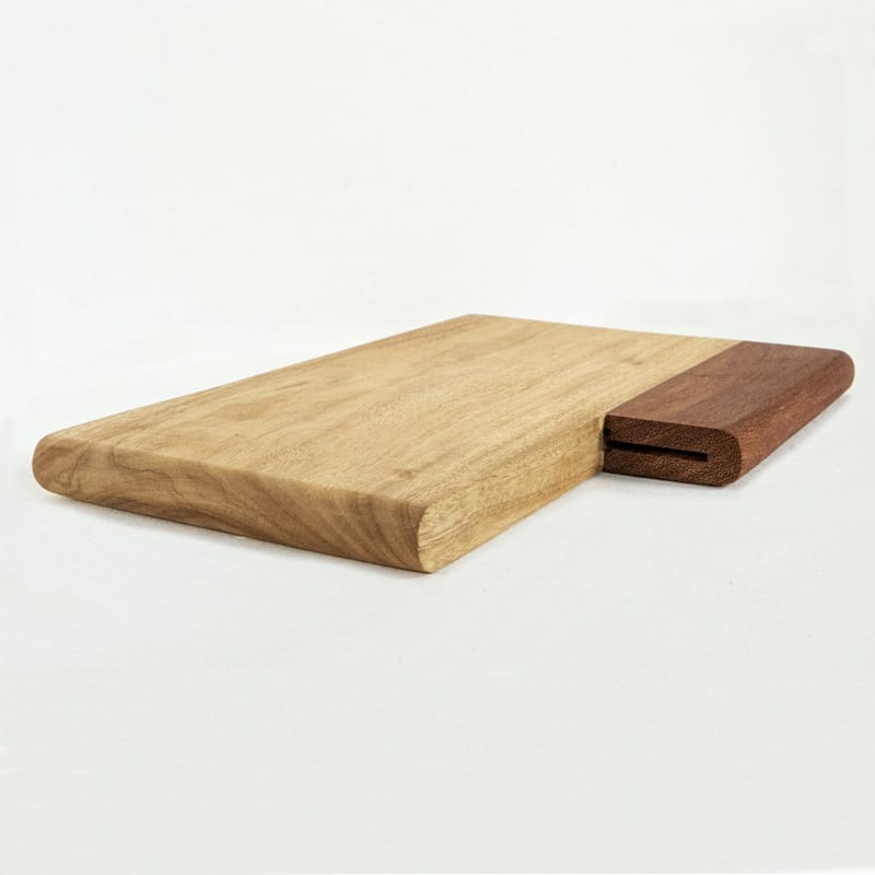 Hecho a mano por talentosos artesanos guatemaltecos, es decorativa y muy funcional. Esta tabla de cortar de madera hecha a mano es única por su combinación de maderas. La sección de la tabla que es para cortar está hecha de madera de palo blanco y el espacio para el cuchillo está hecha de madera de ron ron. La combinación de las dos maderas proporciona un fuerte contraste entre el suave y pálido amarillo del palo blanco y el rojo marrón oscuro de la madera de ron ron. Ambas maderas son premiadas por su durabilidad.