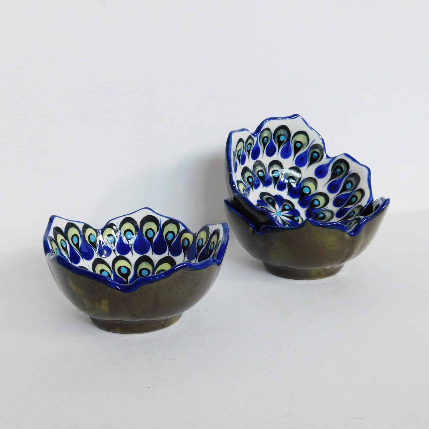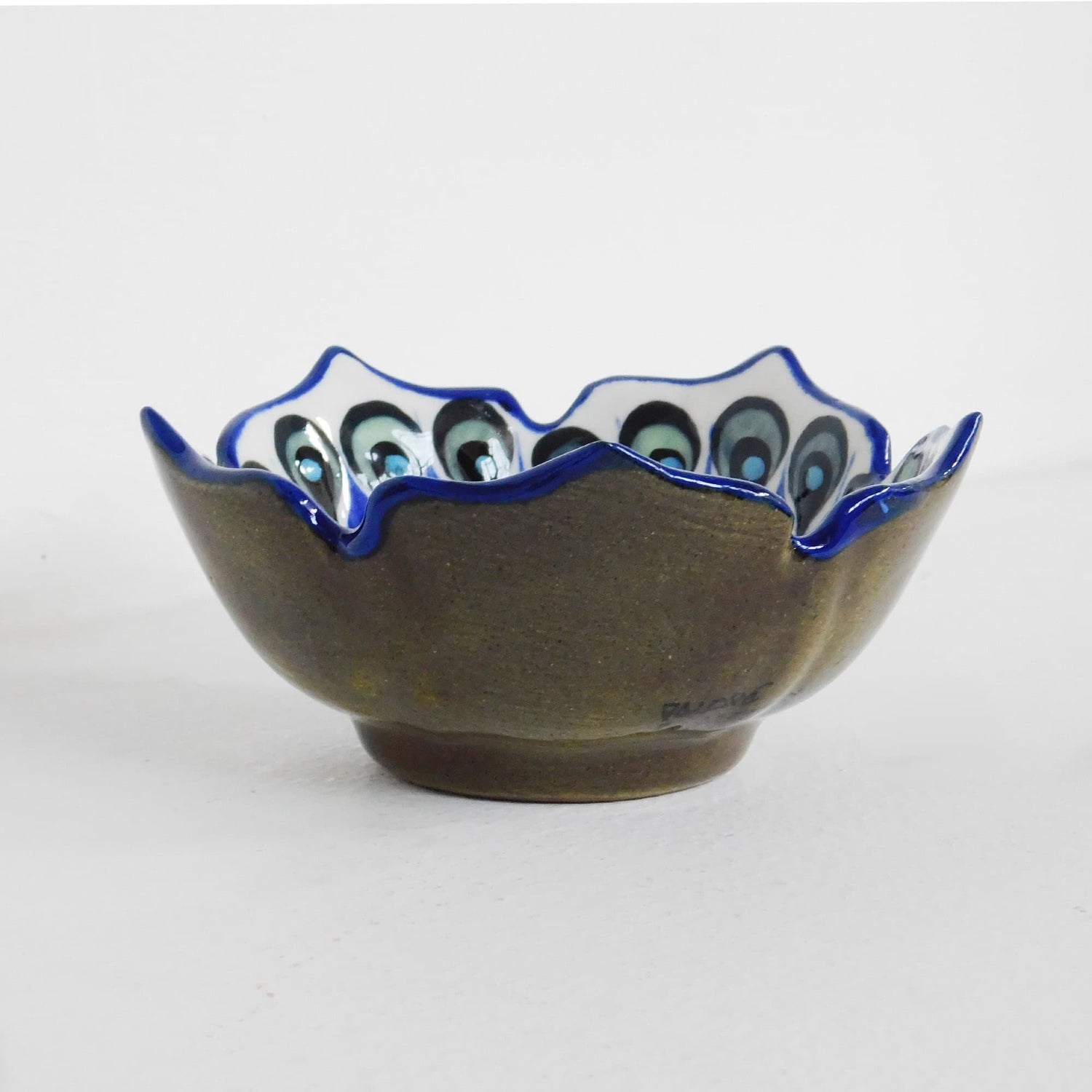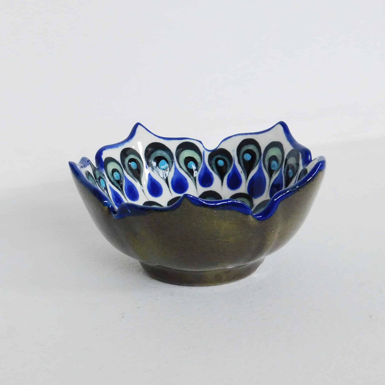Este tazón de cerámica con un elaborado diseño pintado a mano presenta un hermosa patrón de gotas en tonalidades de azul y verde, así como una decoración de picos en el borde. Con su singularidad y belleza, es un accesorio interesante que no puede faltar en tu colección.